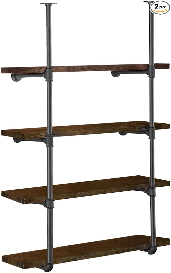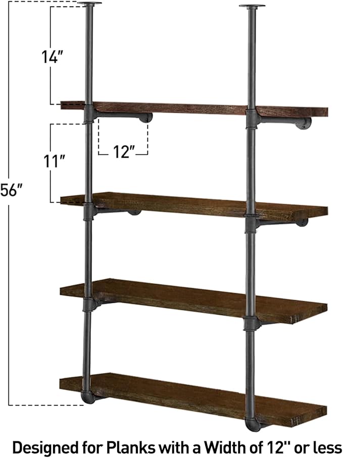 HITOMEN Industrial Iron Pipe Shelves, 2 Set 4-Tier, 56" Tall, 12" Depth, DIY Open Bookshelf Bookcase, Wall Mounted Vintage Retro Shelving, Rustic Farmhouse Pantry Kitchen Storage, Black Shelf Brackets