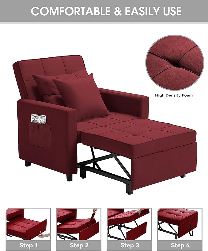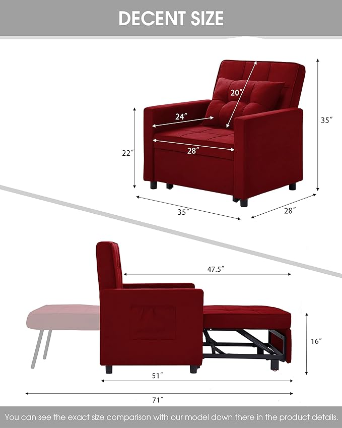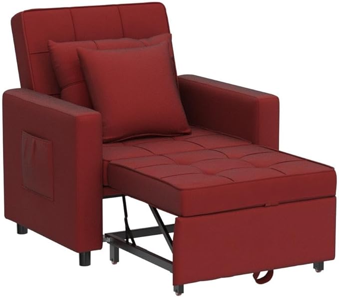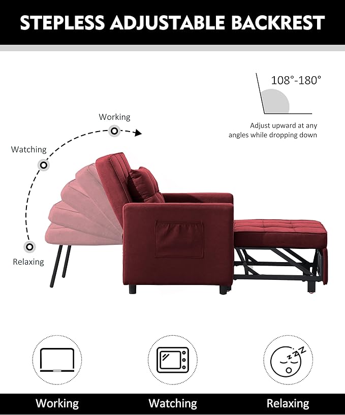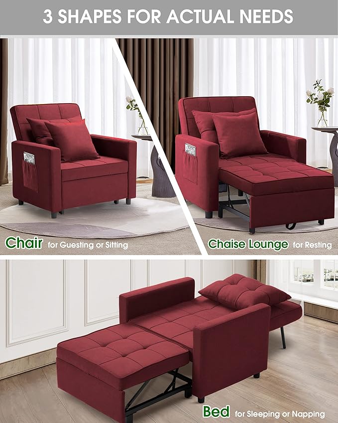 XSPRACER [UPDATED] Convertible Chair Bed, Sleeper Chair Bed 3 in 1, Stepless Adjustable Backrest,Armchair, Sofa, Bed, Fleece, Red, Single One