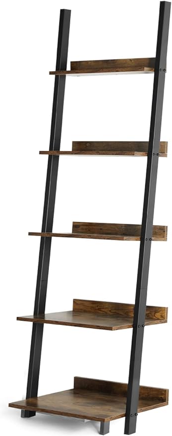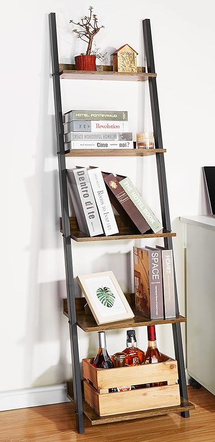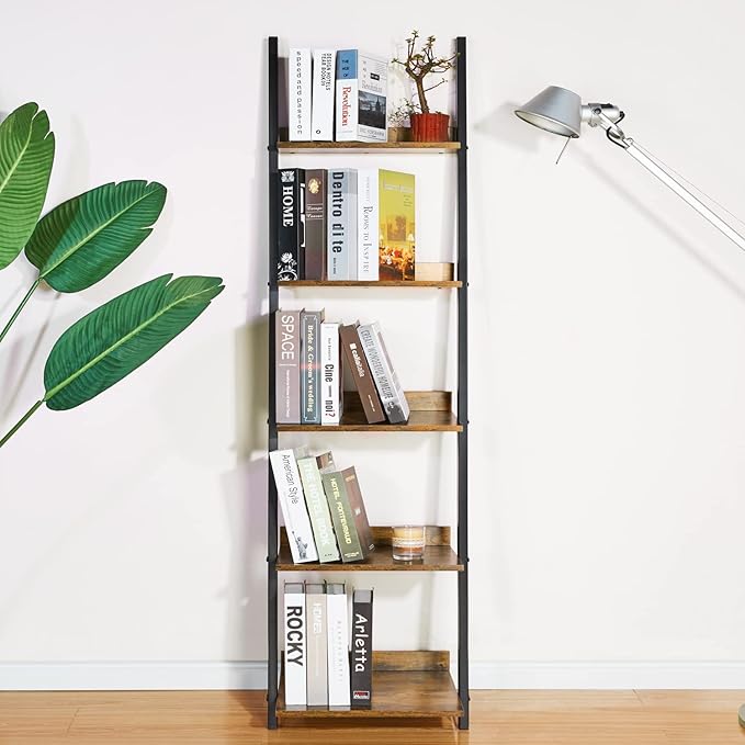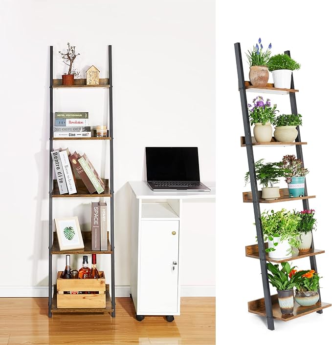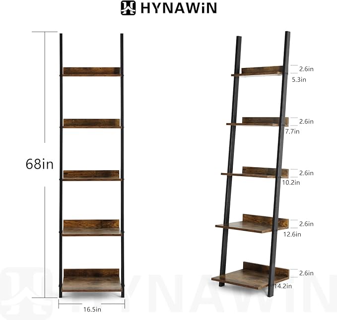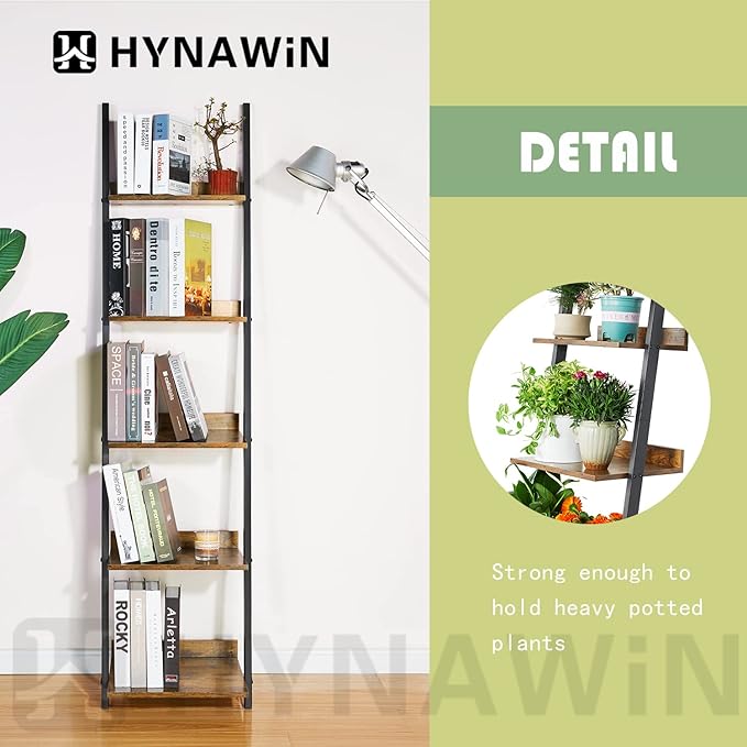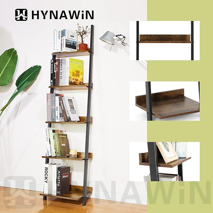 HYNAWIN 5 Tier Ladder Shelf-Wood & Metal Bookcase,Wall Mount Bookshelf Standing Unit,Multipurpose Plant Stand for Livingroom,Kitchen,Space Saving Display Rack,Industrial Accent Furniture