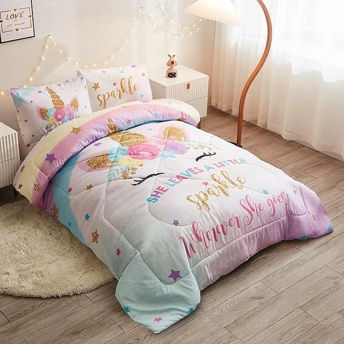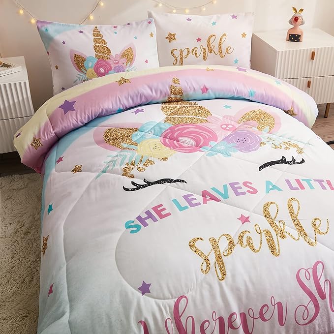 Twin Size Comforter Set for Girls, 3-Piece Bed in a Bag, 3D Colorful Unicorn Bedding Comforter Sheet Set, Ultra Soft and Fluffy, Pink & Rainbow Color