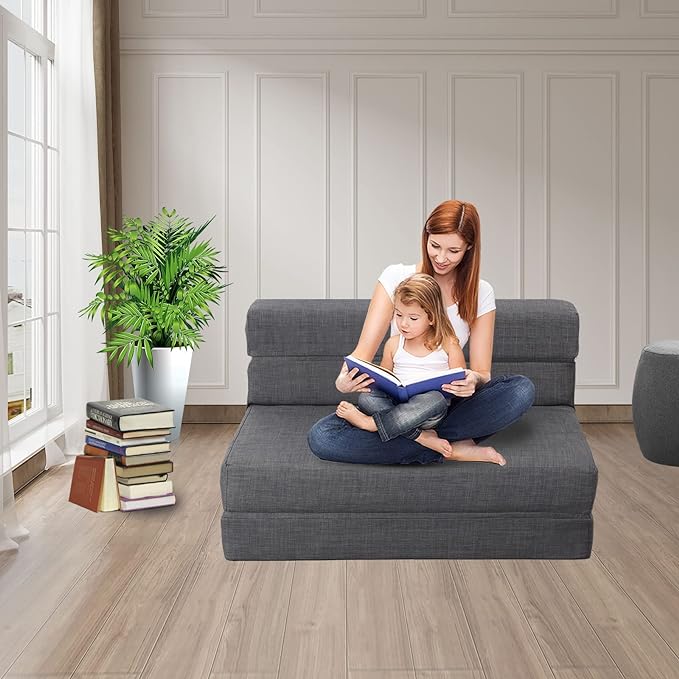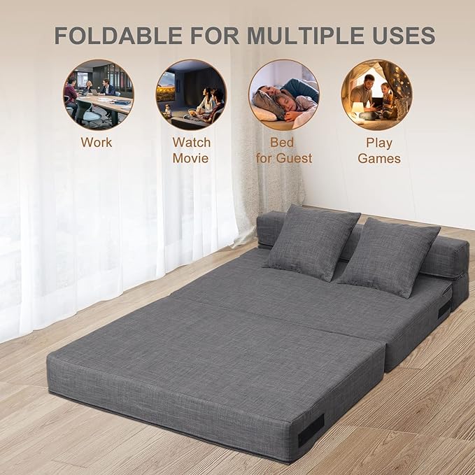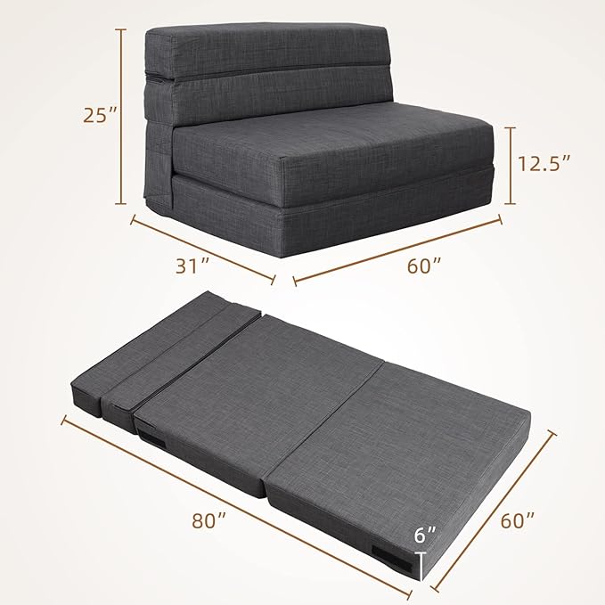 Queen Size Folding Sofa Couch Memory Foam with 2 Pillows Sleeper Chair Lazy Couch Triple Futon Convertible Guest Beds, Washable Cover,Dark Gray