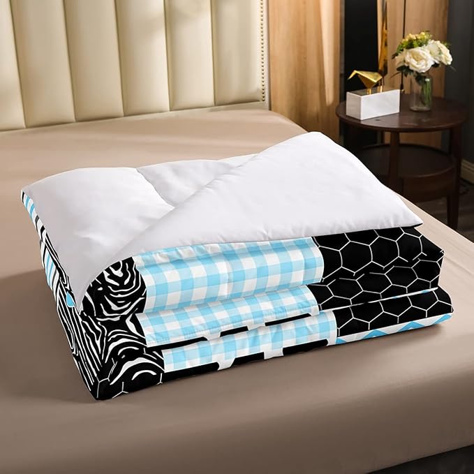 Cute Cow Print Comforter Set Twin Size Kawaii Highland Cow Bedding Set Bedroom Decor Honeycomb Plaid Pattern Geometric Stripes Down Comforter Cartoon Farm Animals Duvet Set, Blue Black Grey