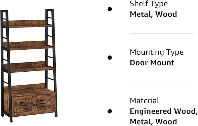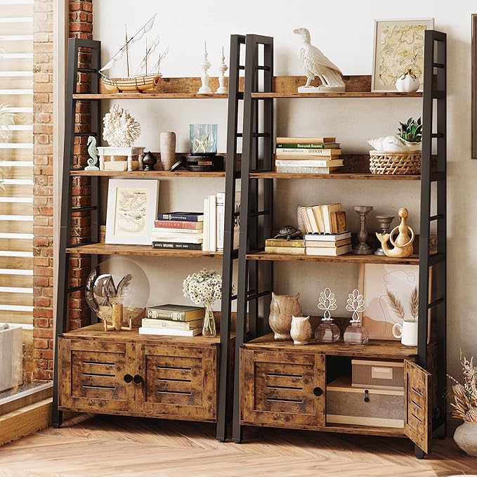 IRONCK Bookshelf with Louvered Doors, 3-Tier Ladder Shelf with Cabinet Industrial Accent Furniture for Bedroom Living Room Home Office, Rustic Brown