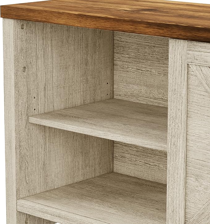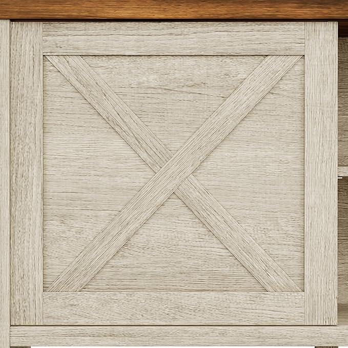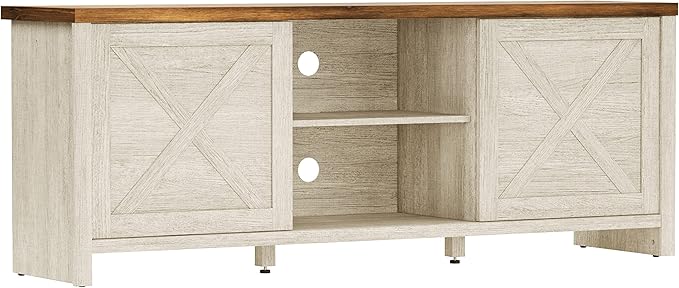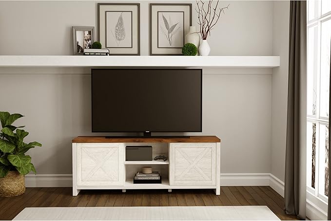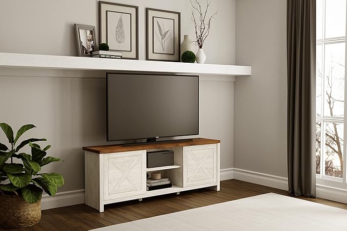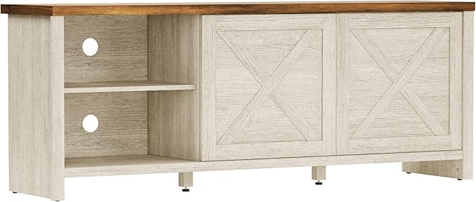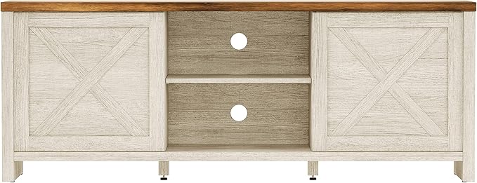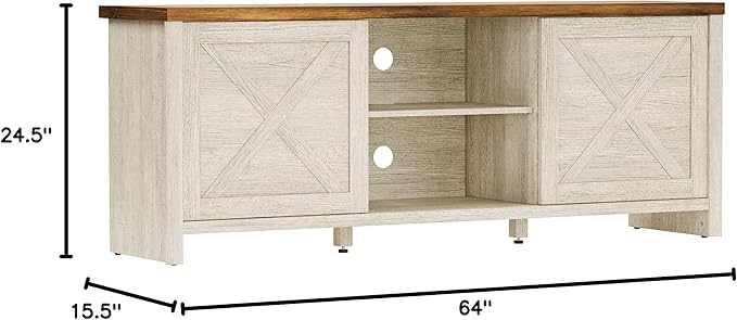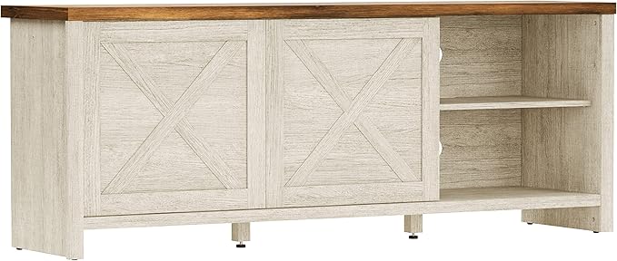 About This Material: Wood Finish: White oak Farmhouse style 64 inch TV stand with sliding barn-style doors Durable high-grade MDF...