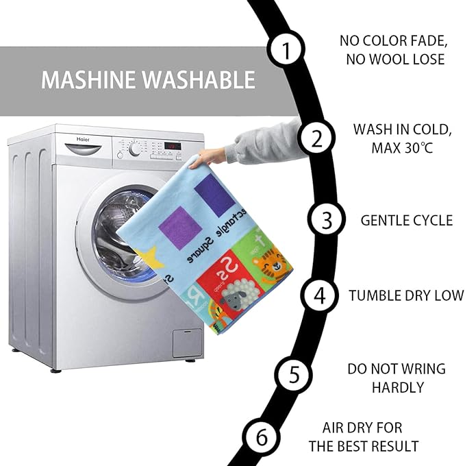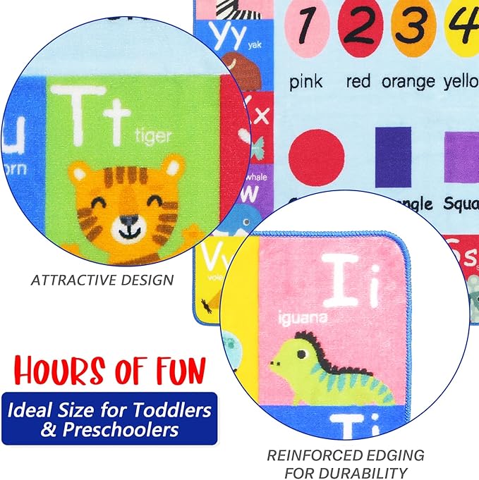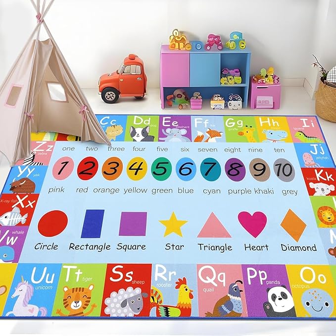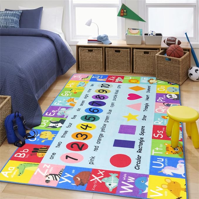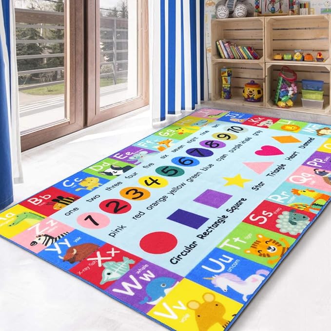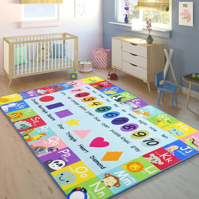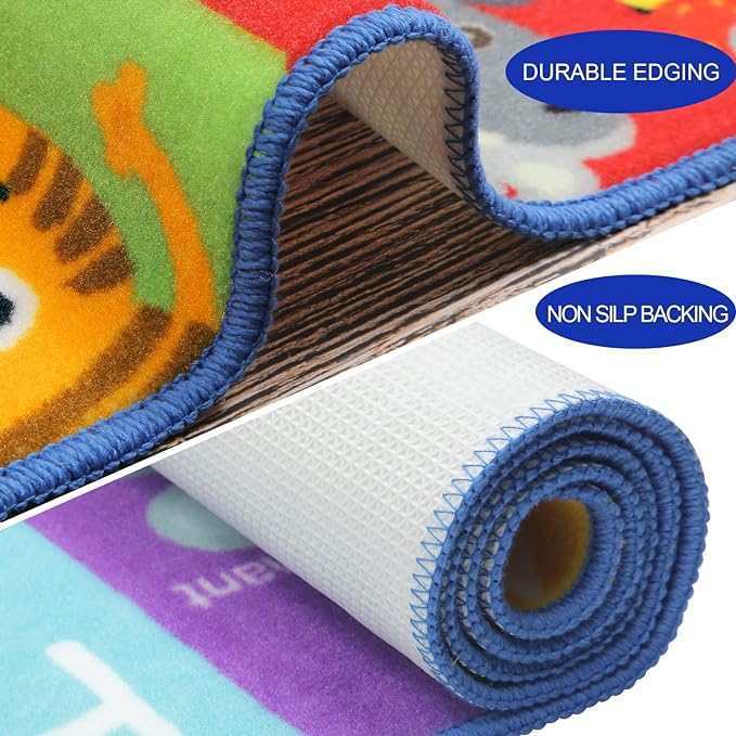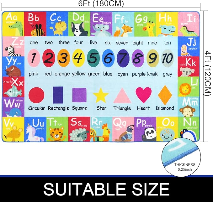 • Perfect for Everywhere: It would be ideal gifts for baby showers, holidays. Also ideal for kids bedrooms, playrooms, kindergarten, classrooms, preschool, elementary school, daycare.The kids rug may be used on multiple surfaces (tile, wood, ceramic, marble, etc).