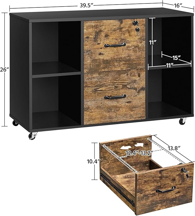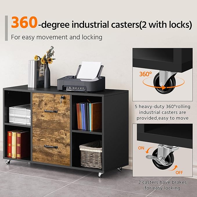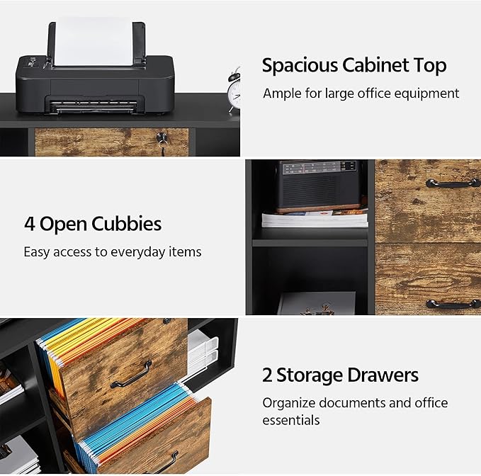 Yaheetech Filing Cabinet Lateral File Cabinet with 2 Drawer and 4 Open Compartments for Letter Size A4 Size, Printer Stand for Home Office, Black/Rustic Brown