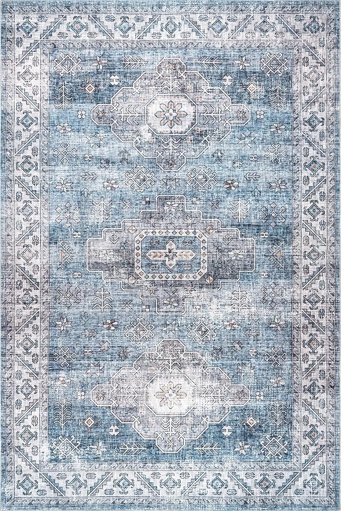 nuLOOM Eva Machine Washable Vintage Faded Medallion Ultra Thin Area Rug, 4' x 6', Blue
