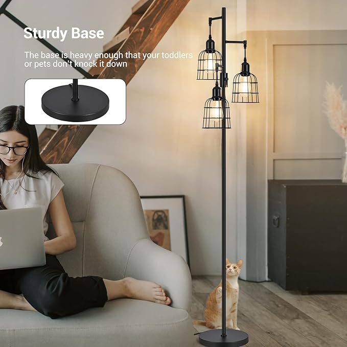 EDISHINE Farmhouse Dimmable Floor Lamp, 3 LED Edison Bulbs Included, Industrial Tree Standing Lamp for Living Room, 3 Metal Birdcage Lampshade, Rustic Tall Corner Lights for Bedroom, Family Room