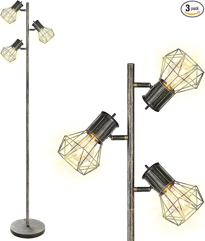 BoostArea Industrial Floor Lamp, Tree-Bronze Gold, 3 Diamond-Shaped Lamp Cages, 3pcs 6W LED Bulbs Included, Eco-Friendly, Reliable Quality, Easy Assembly, Match with Multiple Home Styles