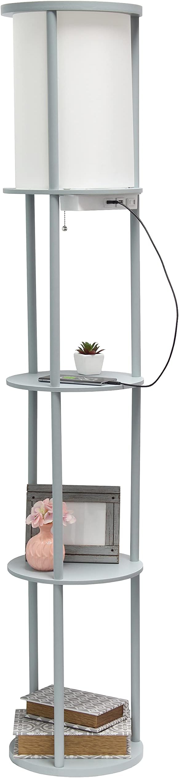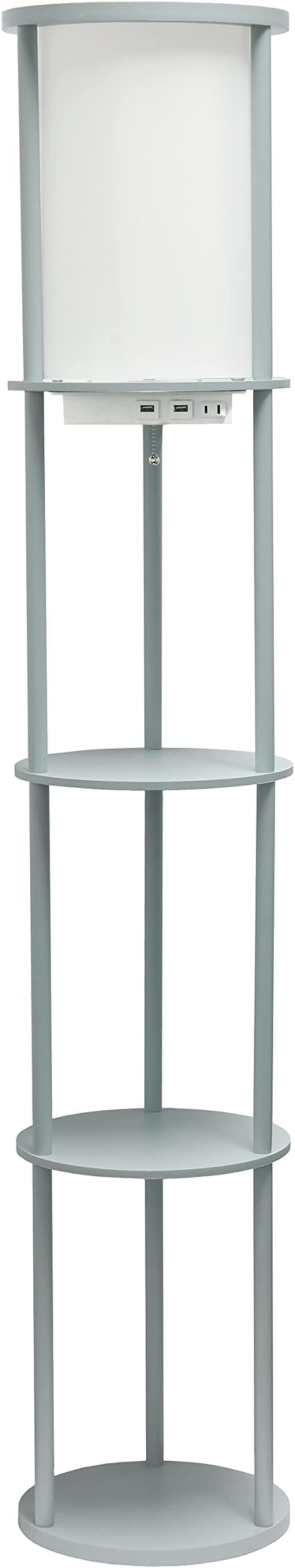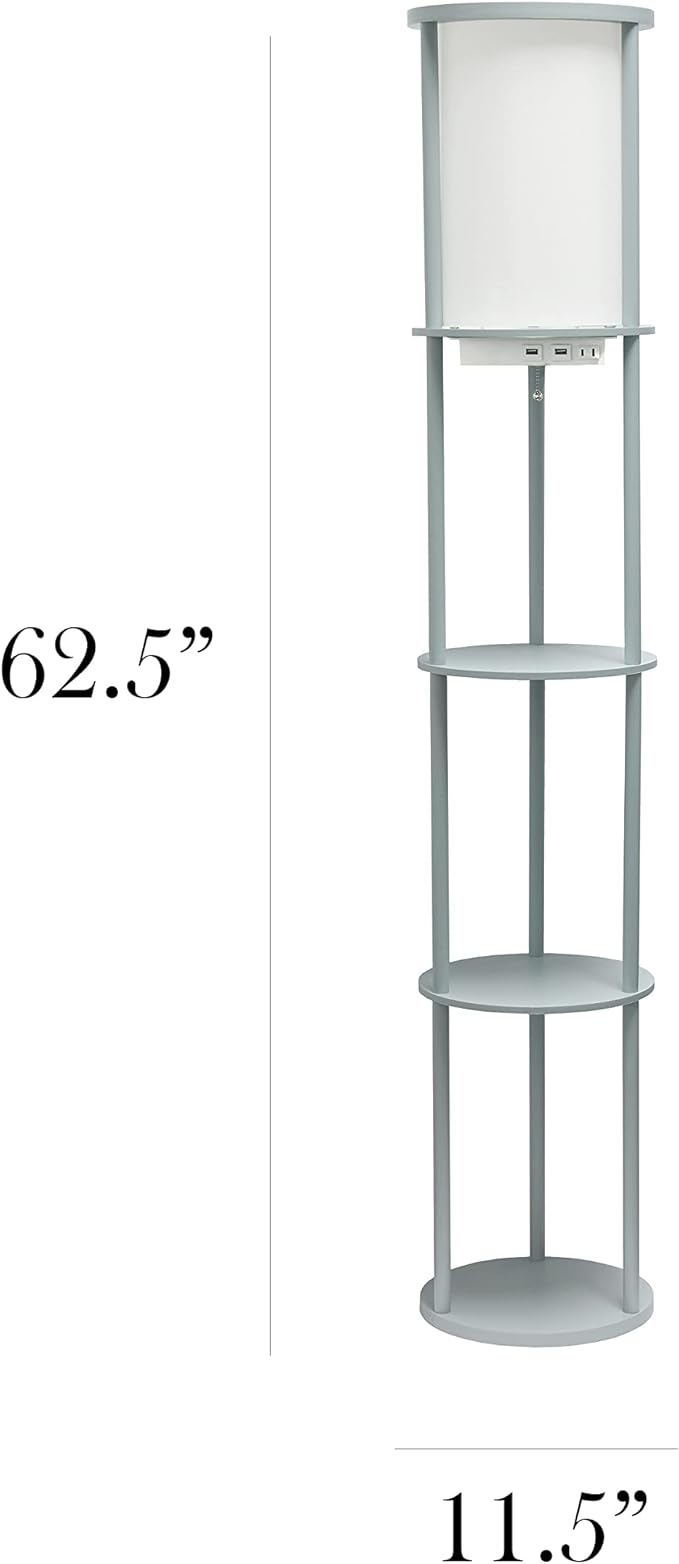 Simple Designs LF2010-GRY 62.5" Round Modern Shelf Etagere Organizer Storage Floor Lamp with 2 USB Charging Ports, 1 Charging Outlet and Linen Shade for Living Room Bedroom, Gray, 11.5 x 11.5 x 62.5