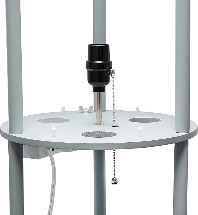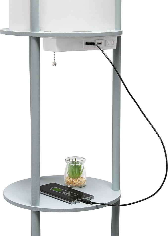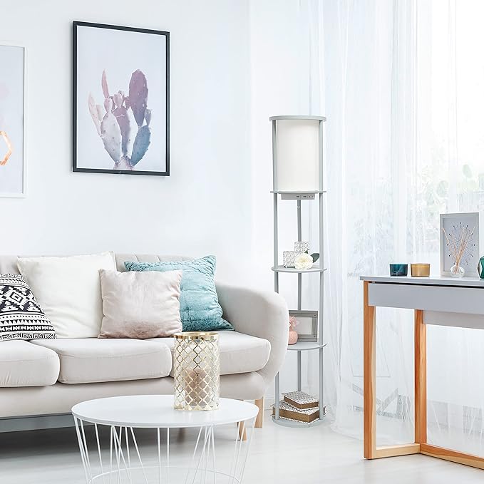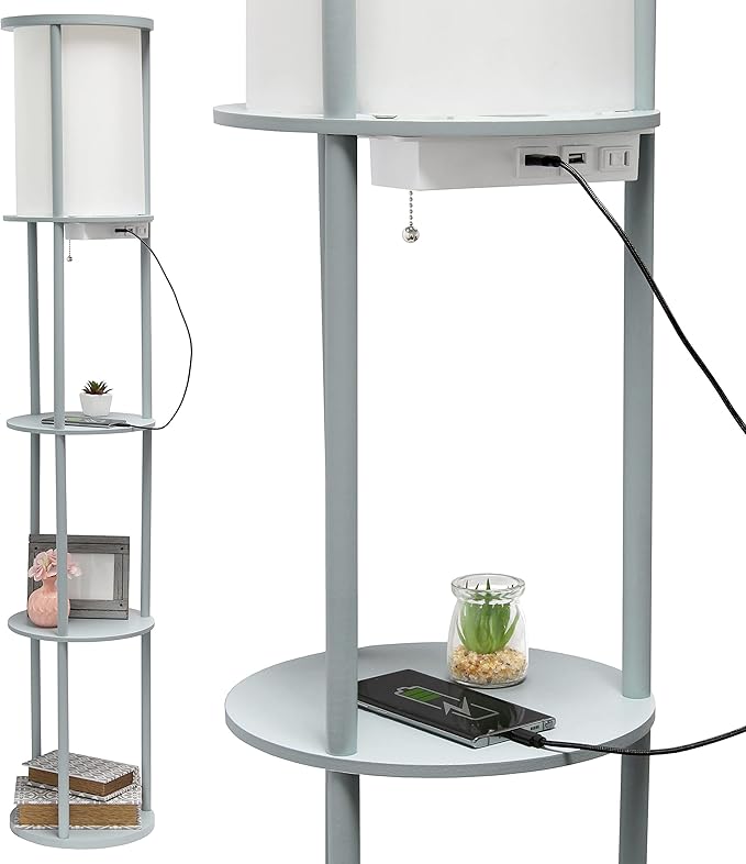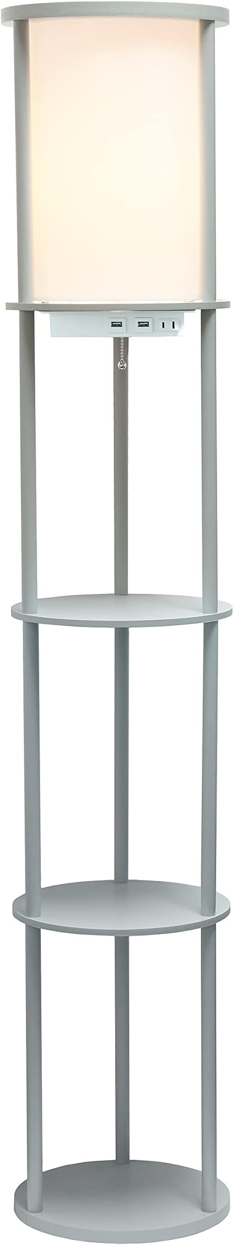 Simple Designs LF2010-GRY 62.5" Round Modern Shelf Etagere Organizer Storage Floor Lamp with 2 USB Charging Ports, 1 Charging Outlet and Linen Shade for Living Room Bedroom, Gray, 11.5 x 11.5 x 62.5