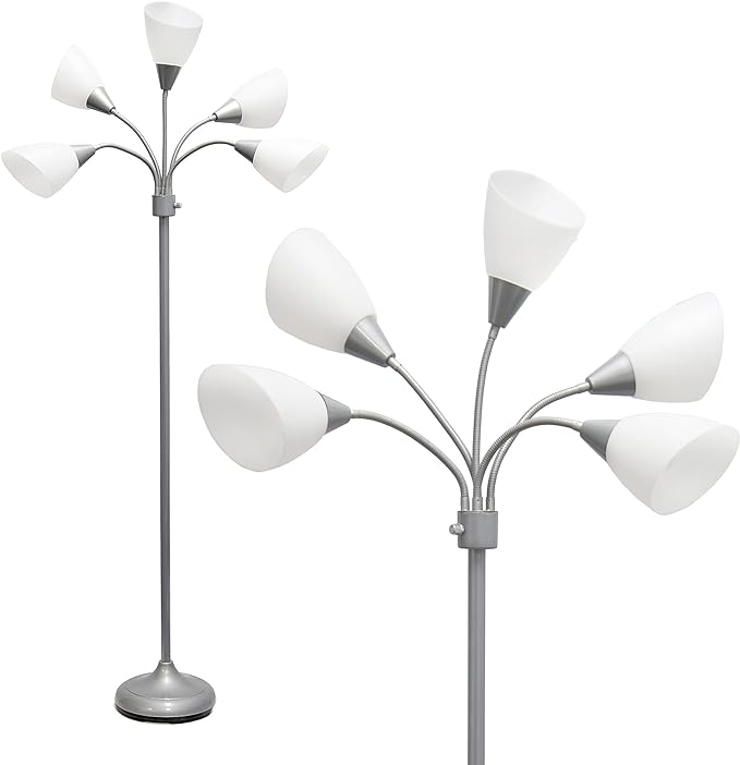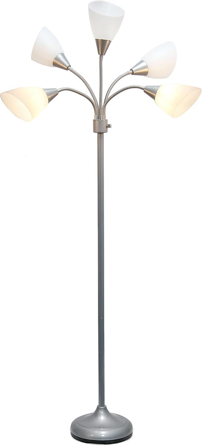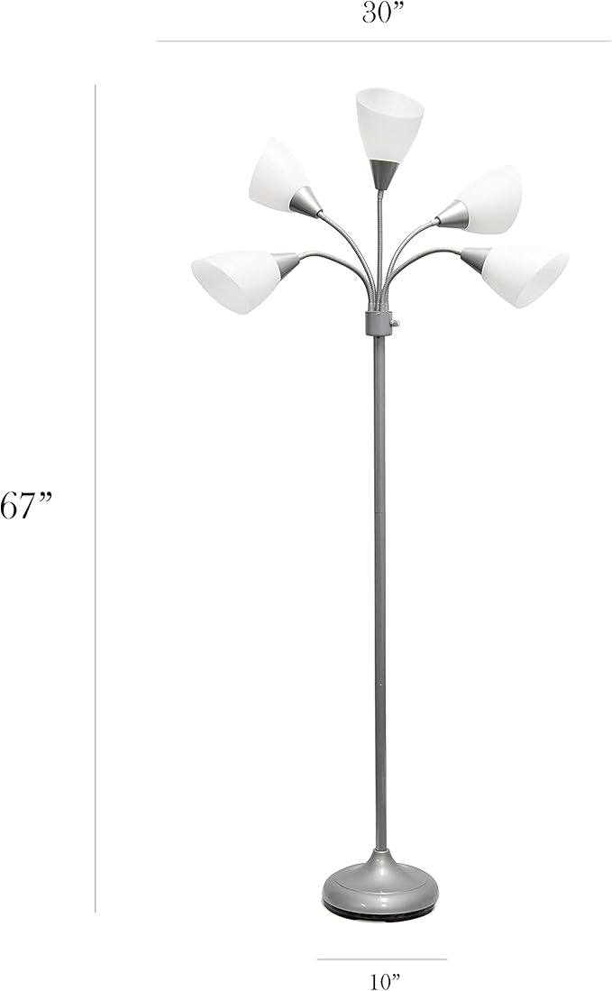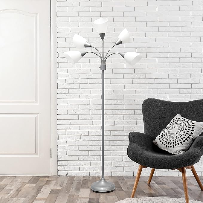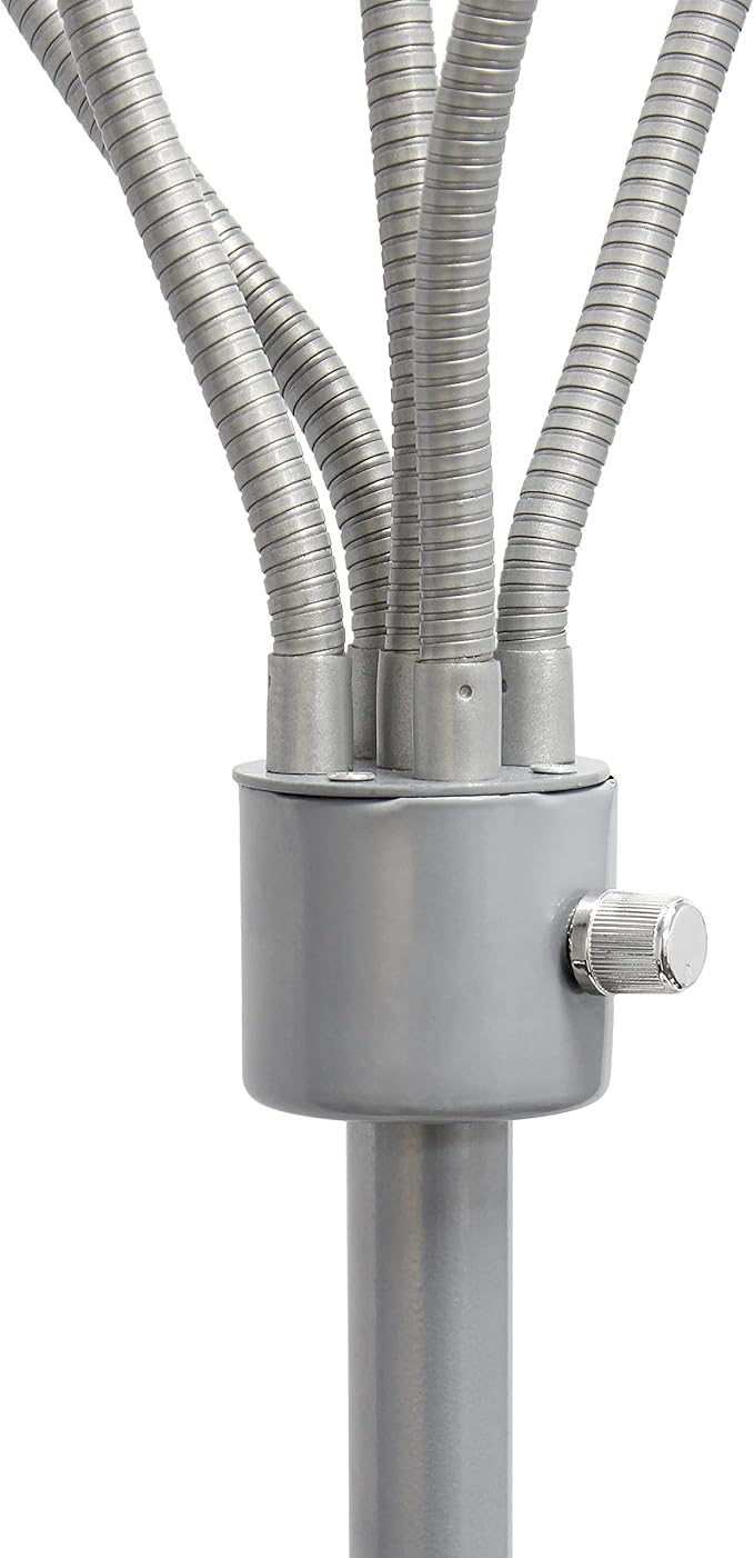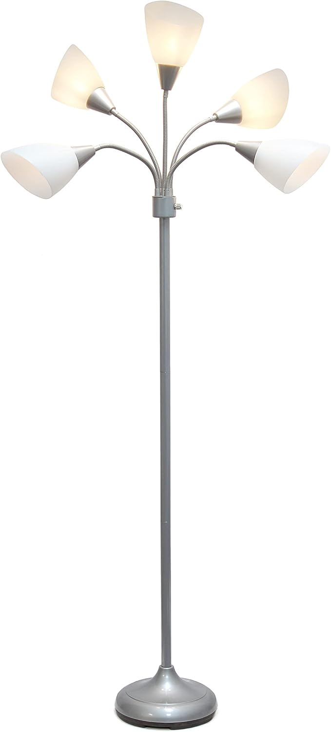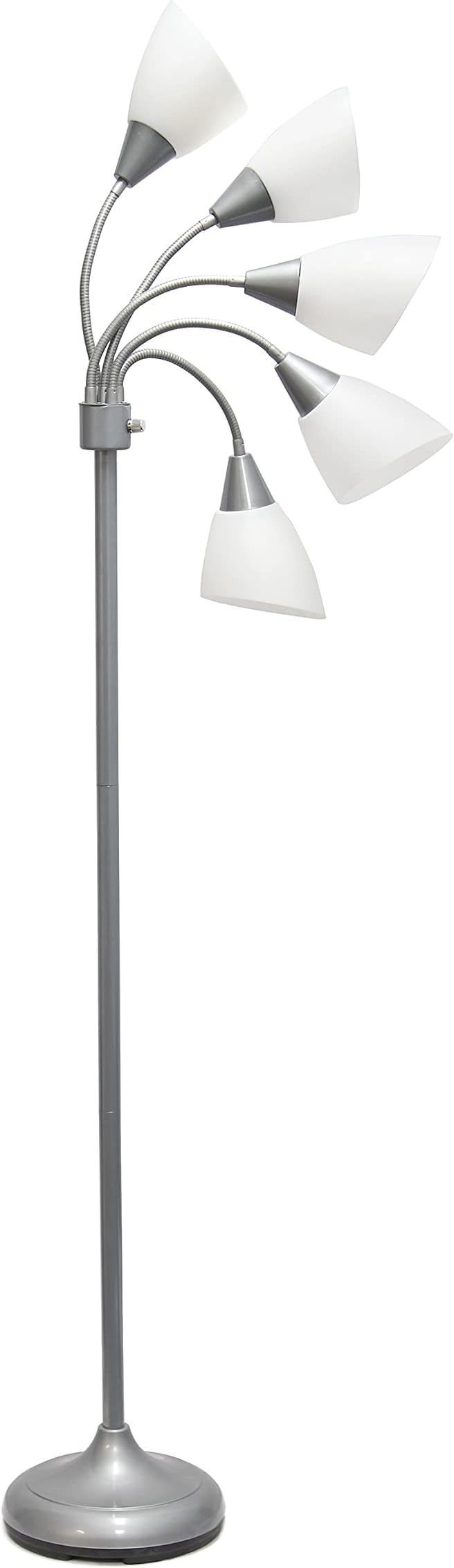 Simple Designs LF2006-SVW 67" Contemporary Multi Head Medusa 5 Light Adjustable Gooseneck Silver Floor Lamp with White Shades for Kids Bedroom Playroom Living Room Office