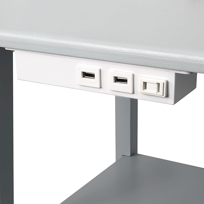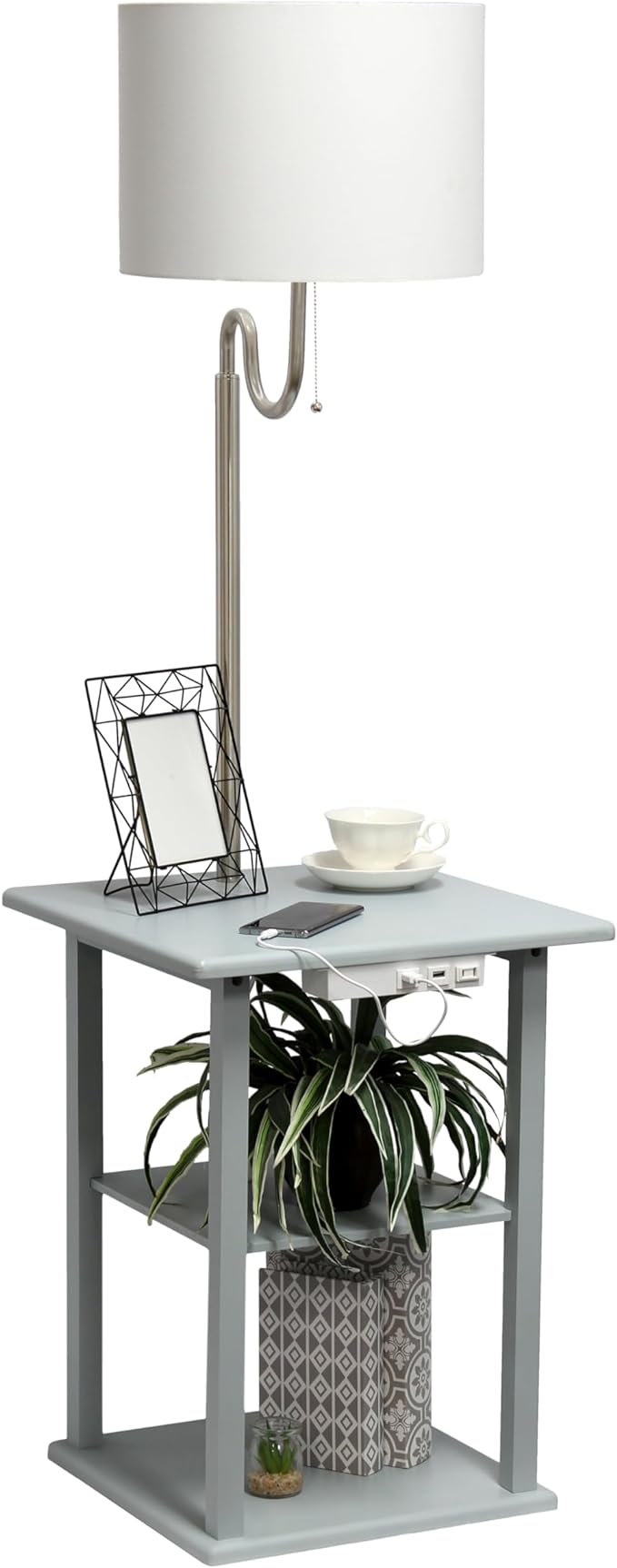 Simple Designs LF2016-GRY 57" Modern 2 Tier End Table Floor Lamp Combination with 2 x USB Charging Ports & Power Outlet with White Drum Fabric Shade for Bedroom, Living Room, Office, Gray