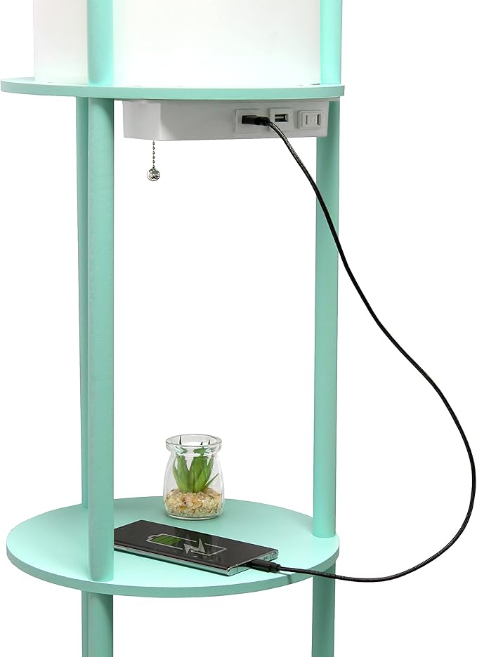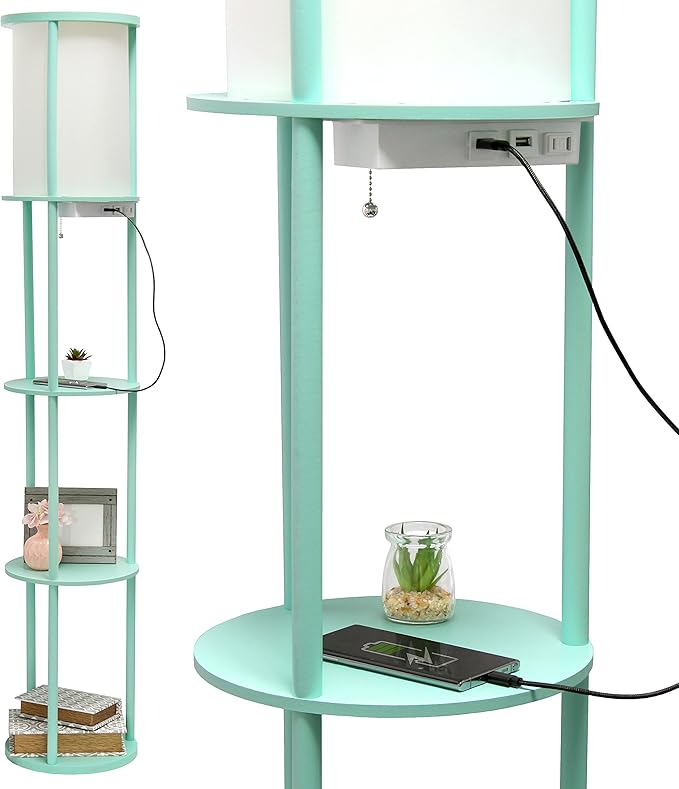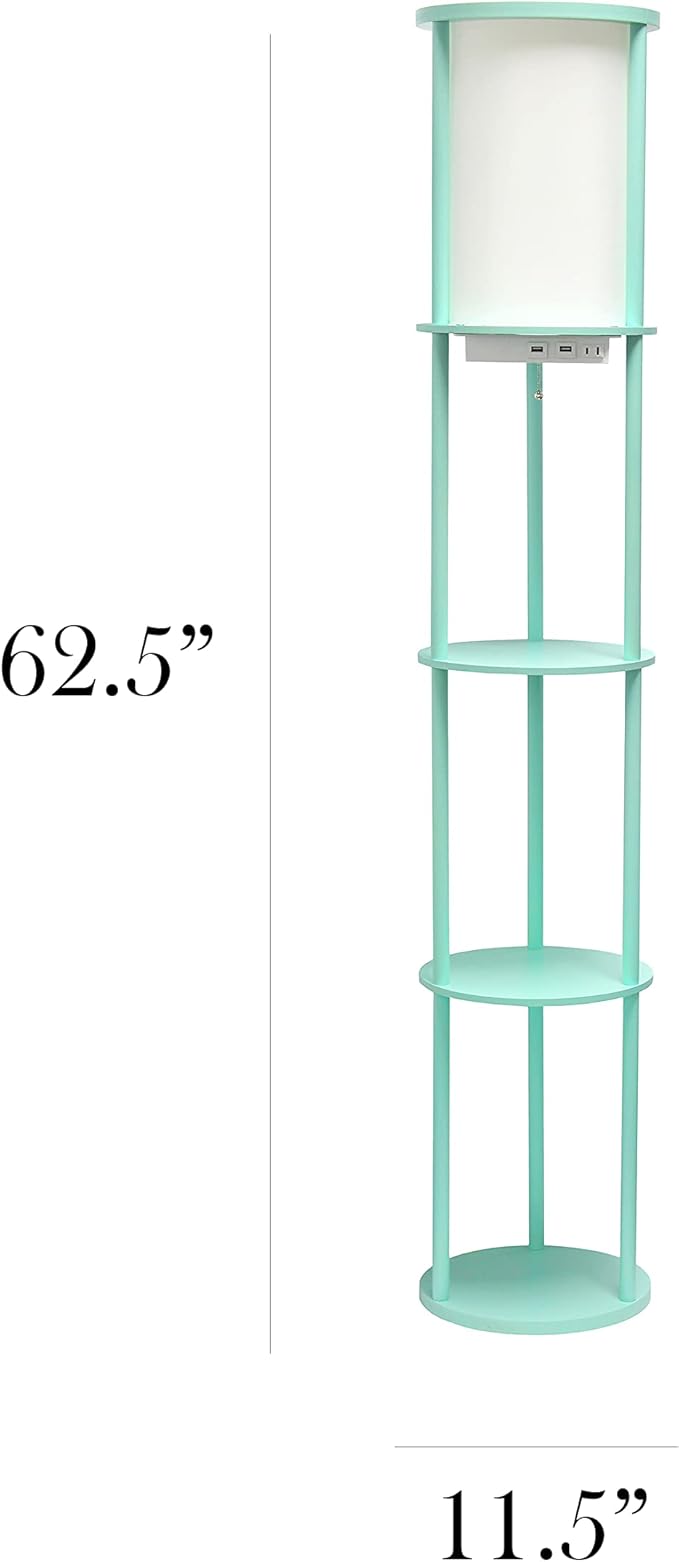 Simple Designs LF2010-AQU 62.5" Round Modern Shelf Etagere Organizer Storage Floor Lamp with 2 USB Charging Ports, 1 Charging Outlet and Linen Shade for Living Room Bedroom, Aqua, 11.5 x 11.5 x 62.5