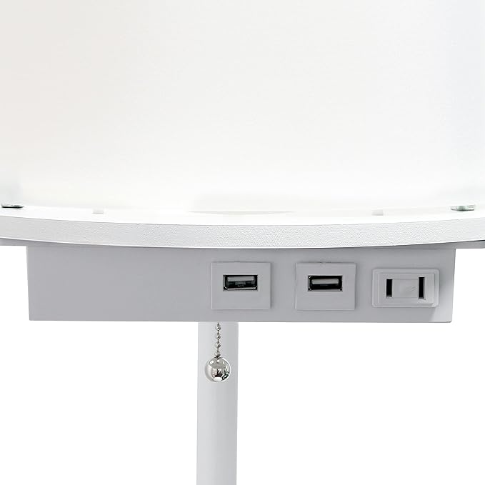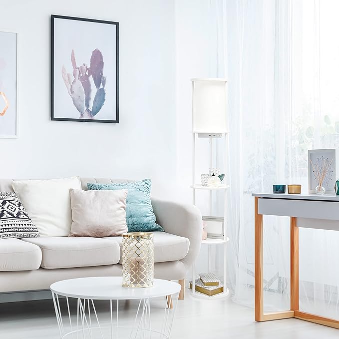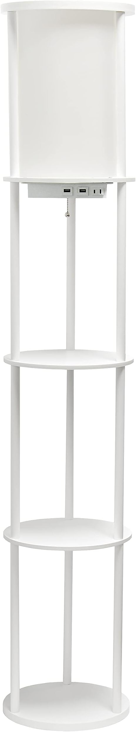 Simple Designs 62.5" LF2010-WHT Round Modern Shelf Etagere Organizer Storage Floor Lamp with 2 USB Charging Ports, 1 Charging Outlet and Linen Shade for Living Room Bedroom Office, White