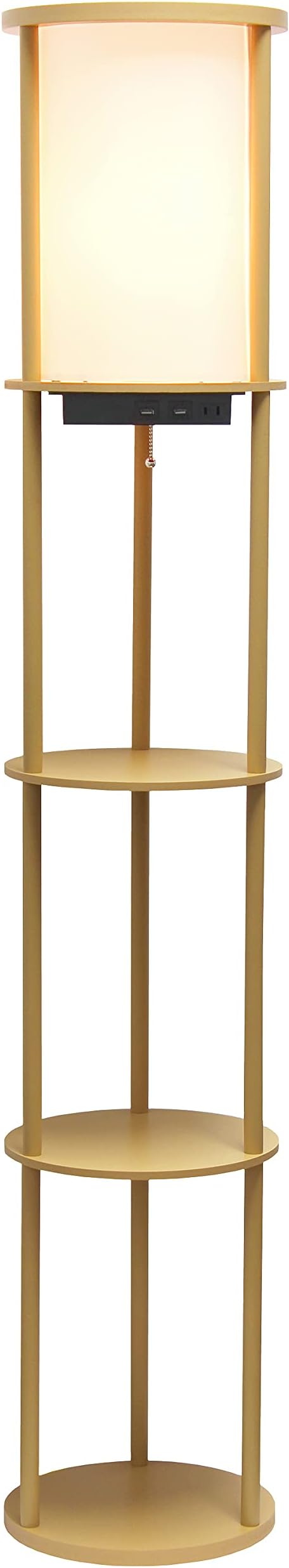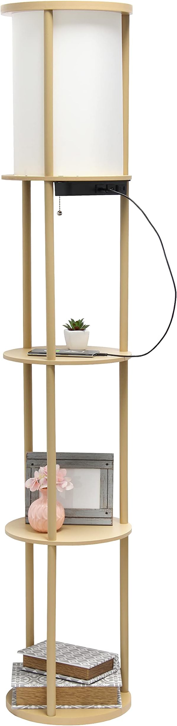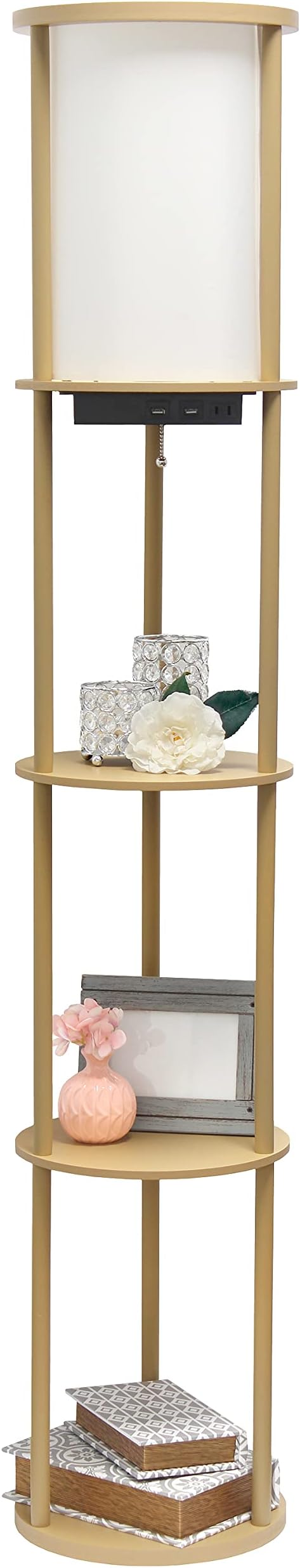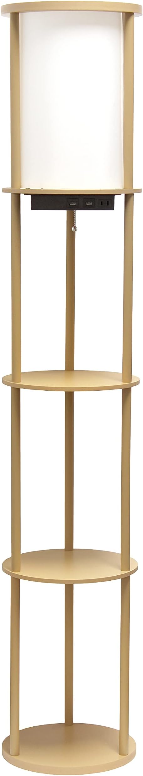 Simple Designs LF2010-TAN 62.5" Round Modern Shelf Etagere Organizer Storage Floor Lamp with 2 USB Charging Ports, 1 Charging Outlet and Linen Shade for Living Room Bedroom Office, Tan
