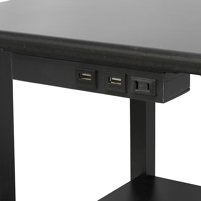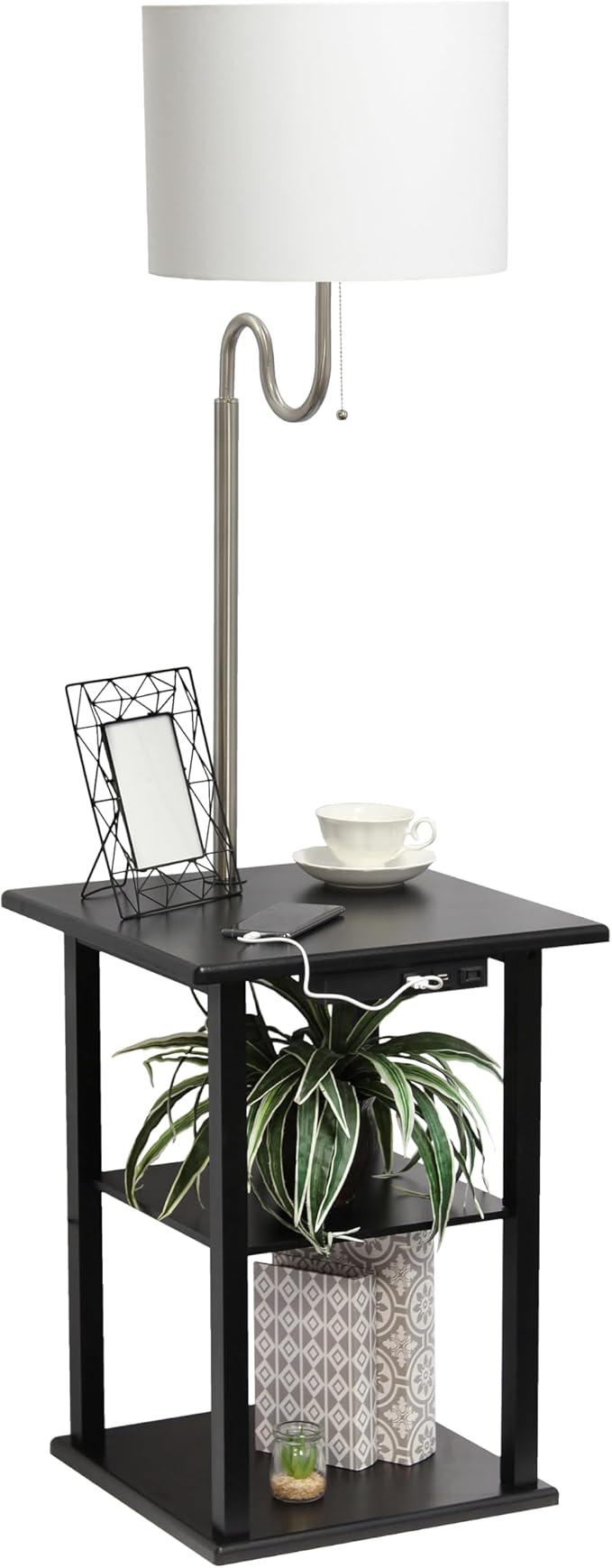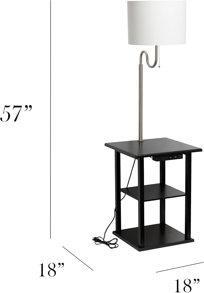 Simple Designs LF2016-BLK 57" Modern 2 Tier End Table Floor Lamp Combination with 2 x USB Charging Ports & Power Outlet with White Drum Fabric Shade for Bedroom, Living Room, Office, Black
