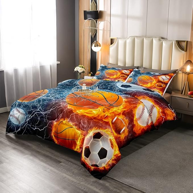 Erosebridal Sports Bedding Set for Boys Queen,Baseball Basketball Comforter Set Soccer Football Bedding Comforter Sets for Kids Teens Men,Red Blue Ice Fire Lightning Decor Quilt Duvet Set 3 Pcs