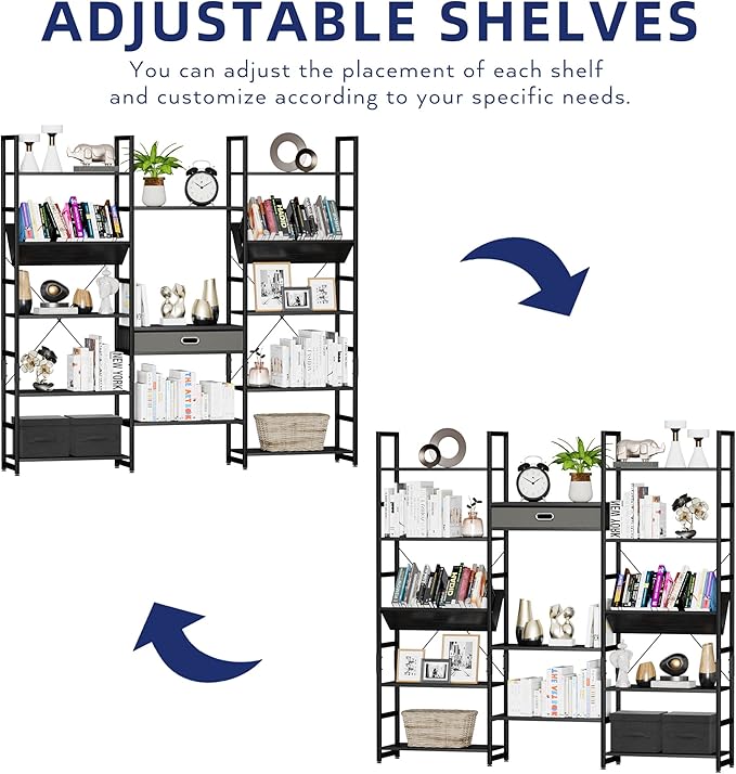 NUMENN Triple Wide 5 Tier Bookshelf, Adjustable Rustic Industrial Style Book Shelves, Modern Bookcases and Bookshelves Furniture for Bedroom, Living Room and Home Office, Elegant Black