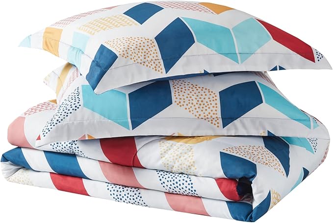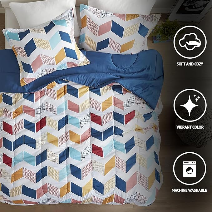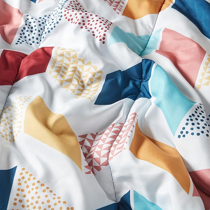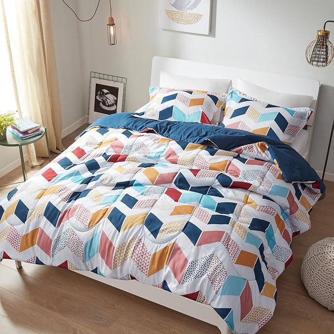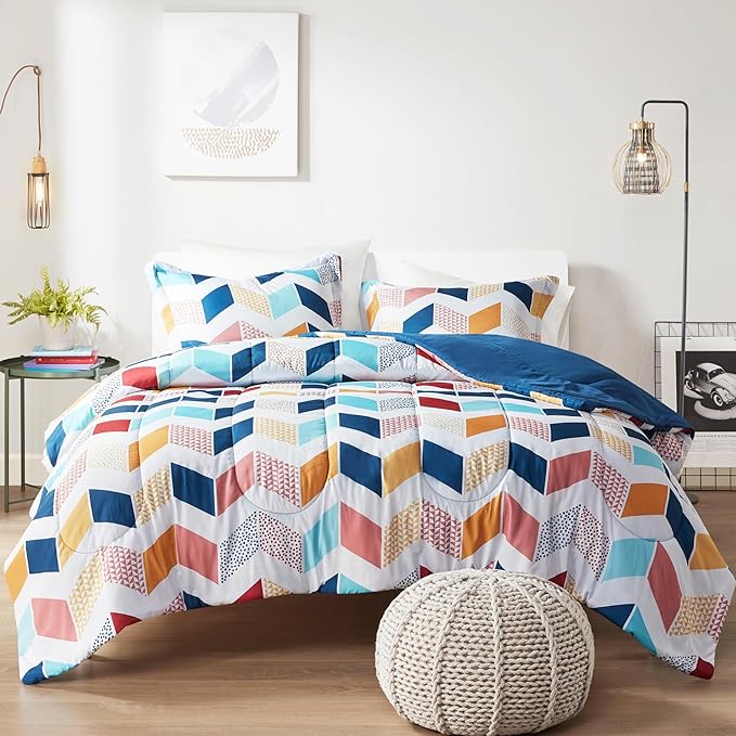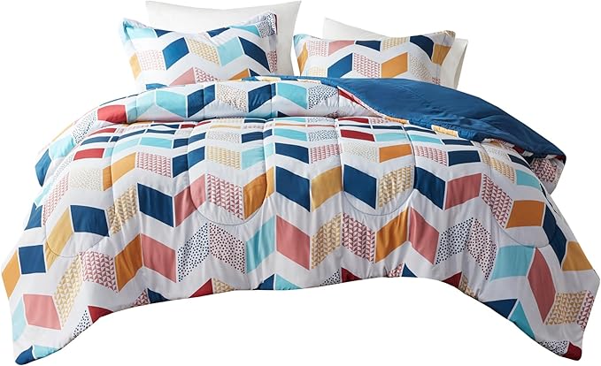 Comfort Spaces Kylar Cozy Comforter Set, Vibrant Chevron Ruching Design with Solid Reverse, All Season Down Alternative Bedding with Matching Sham, Full/Queen (88 in x 92 in), Multi/Aqua 3 Piece