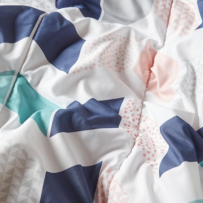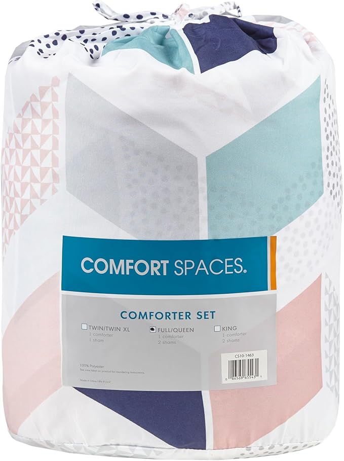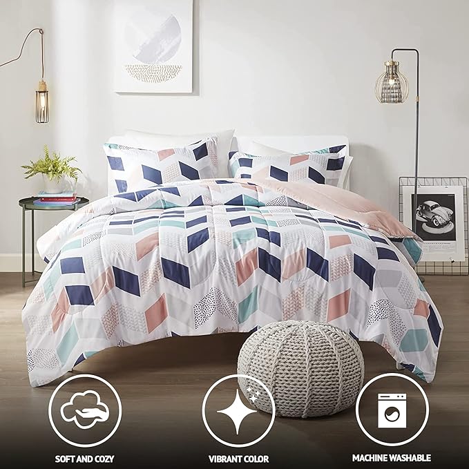Comfort Spaces Kylar Cozy Comforter Set, Vibrant Chevron Ruching Design with Solid Reverse, All Season Down Alternative Bedding with Matching Sham, Full/Queen (88 in x 92 in), Multi/Blush 3 Piece