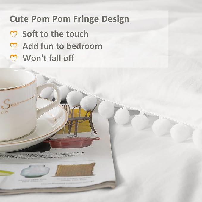 Litanika Comforter Full Size Set White,3 Pieces White Boho Pom Pom Lightweight Bed Comforter Full,All Season Soft Solid Color Bedding Comforter Sets (1 Comforter 79x90 Inch, 2 Pillowcases)