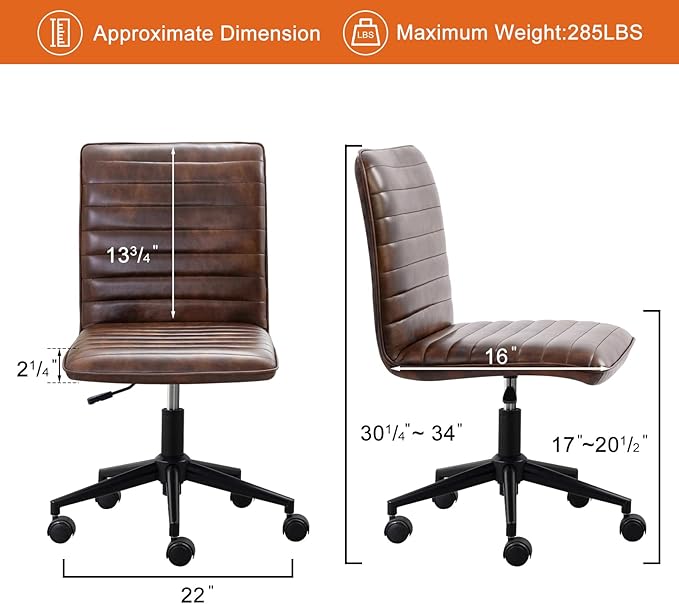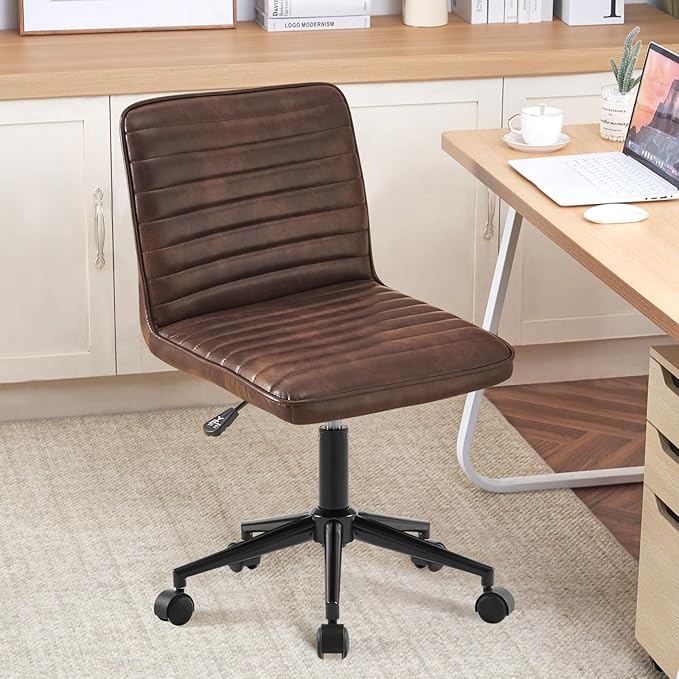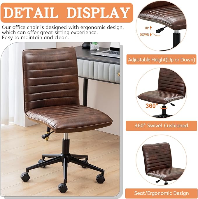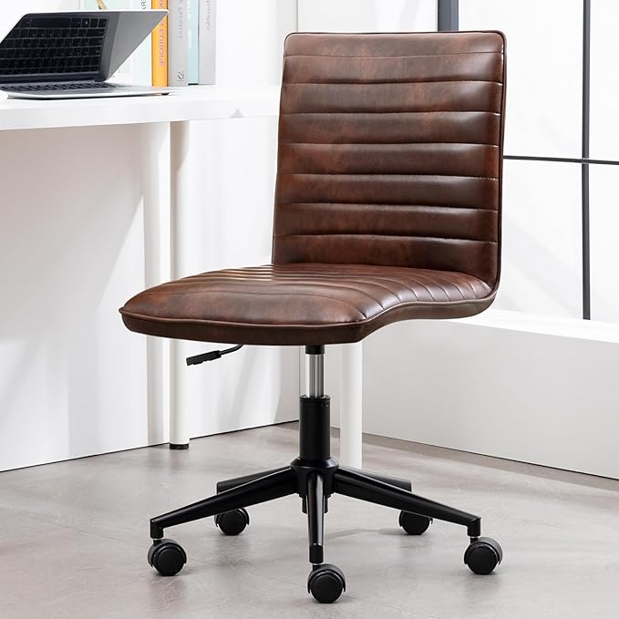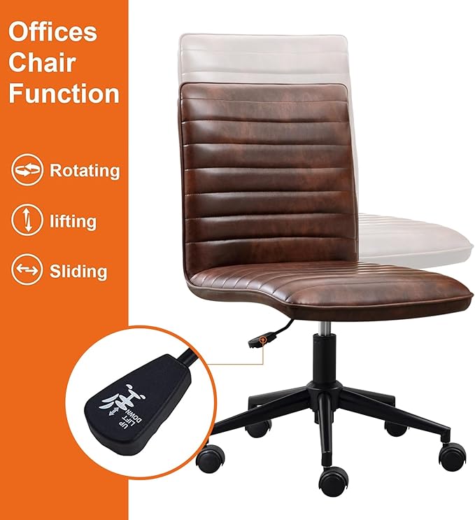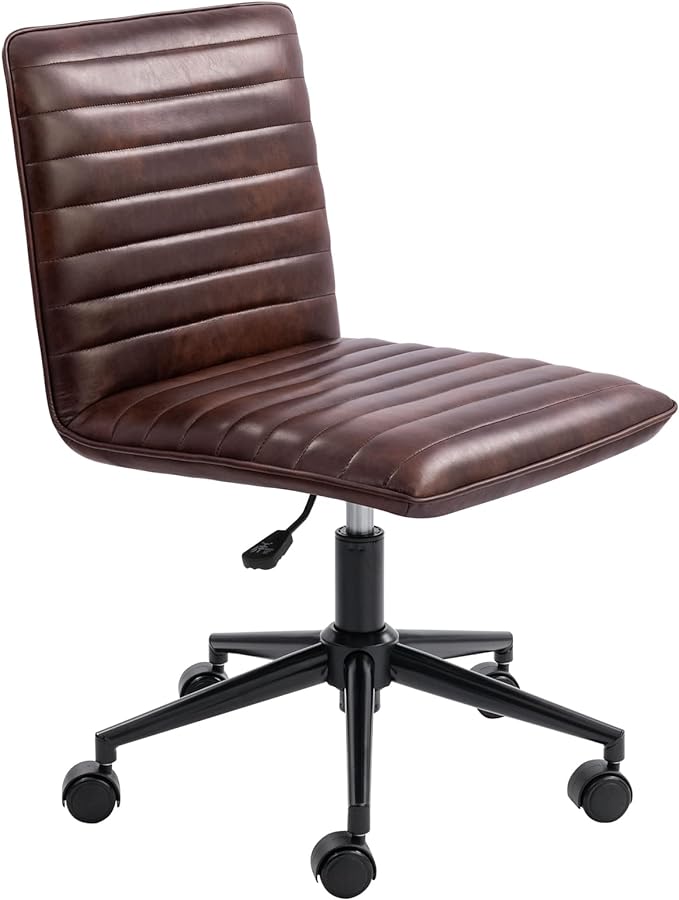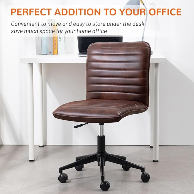 Furniliving Leather Home Office Chair, Armless Vanity Desk Task Chair with Wheels 360° Swivel Computer Rolling Desk Chair with Back, Adjustable Accent Chair with Base Stool
