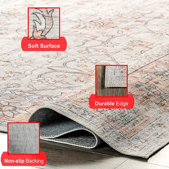 nuLOOM Marlena Faded Floral Machine Washable Ultra Thin Area Rug, 5' x 8', Peach