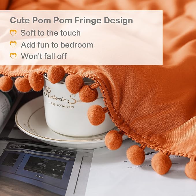 Litanika King Size Comforter Set Burnt Orange,3 Pieces Burnt Orange Boho Pom Pom Lightweight Bed Comforter, All Season Solid Color Bedding Comforter Sets (1 Comforter 104x90 Inch, 2 Pillowcases)