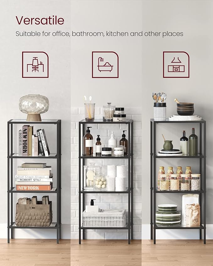 VASAGLE Bookcase, 4-Tier Bookshelf, Slim Shelving Unit for Bedroom, Bathroom, Home Office, Tempered Glass, Steel Frame, Ink Black ULGT028B61
