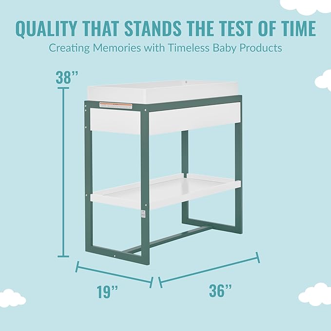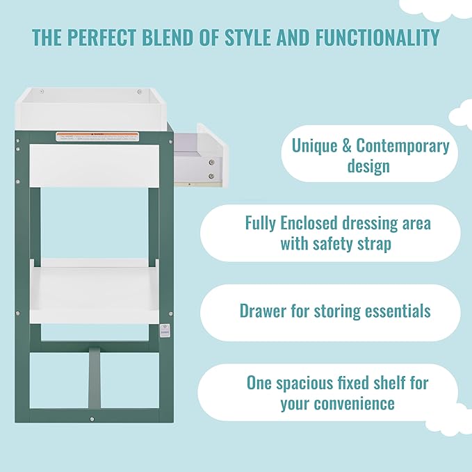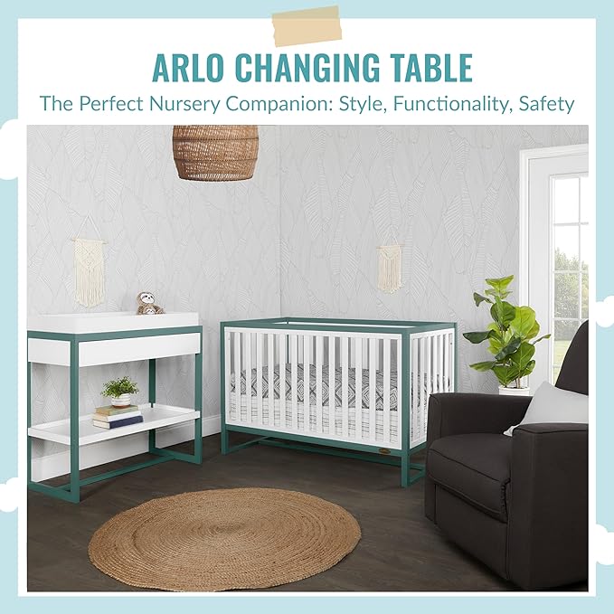 Arlo Changing Table in Jungle Green, Made of Solid New Zealand Pinewood, Non-Toxic Finish, Comes with Water Resistant Mattress Pad & Safety Strap