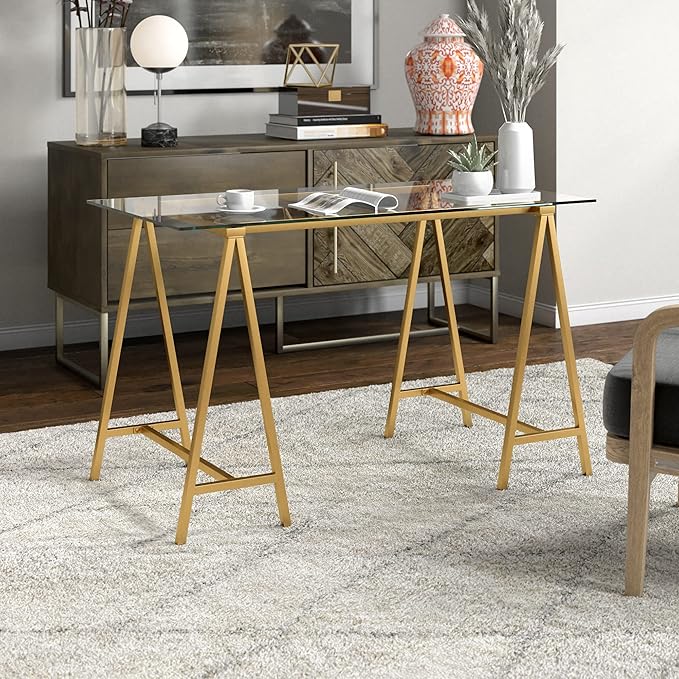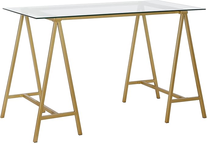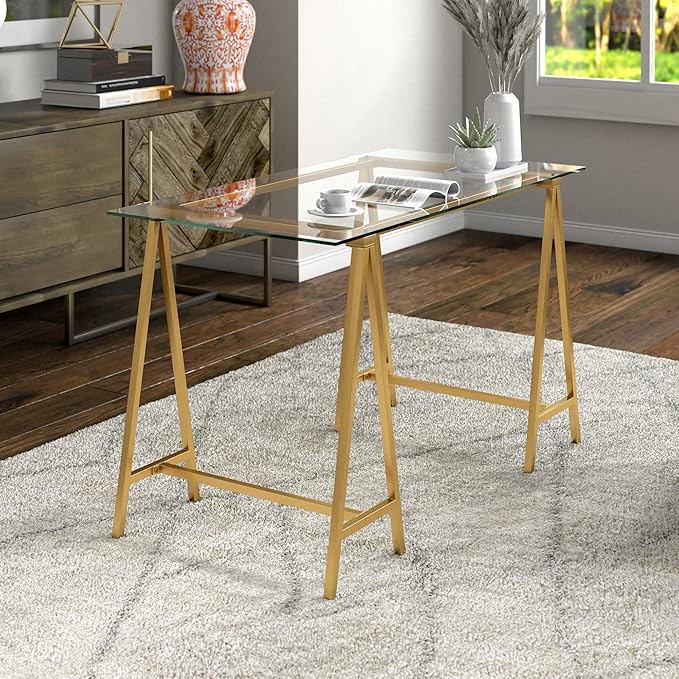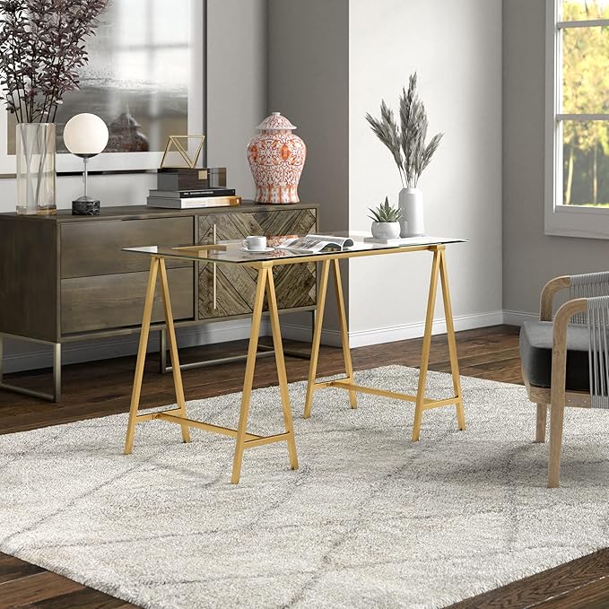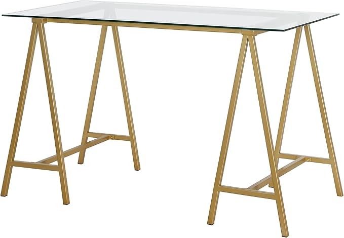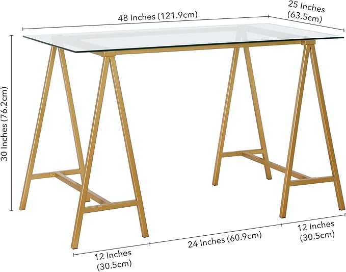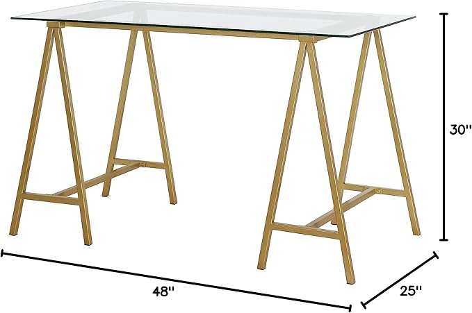 About This Handcrafted brass finish applied to the steel frame. Desktop is made of sturdy tempered glass. Tabletop has a...
