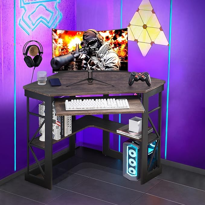 About This Corner desk with keyboard tray and two open shelves on the side provides working space and extra plenty...