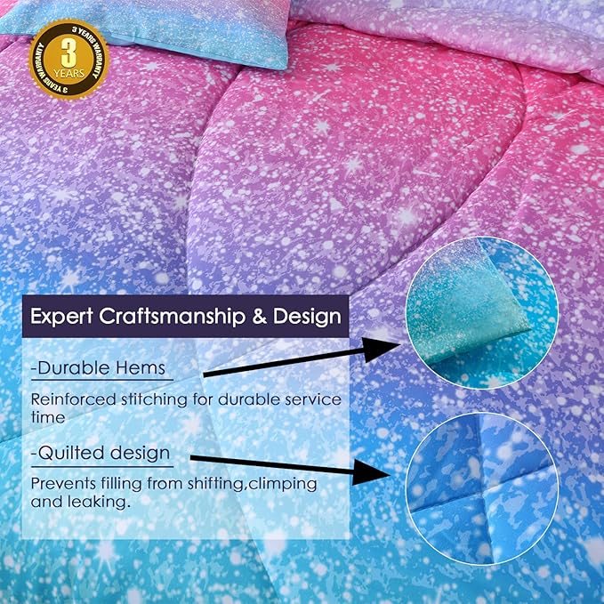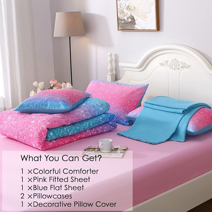 JQinHome Glitter Comforter Set Queen Size, 6 Piece Bed in A Bag 3D Colorful Duvet Pink Blue Bedding Set for Girls Women (1 Comforter,2 Pillowcases,1 Flat Sheet,1 Fitted Sheet,1 Cushion Cover)