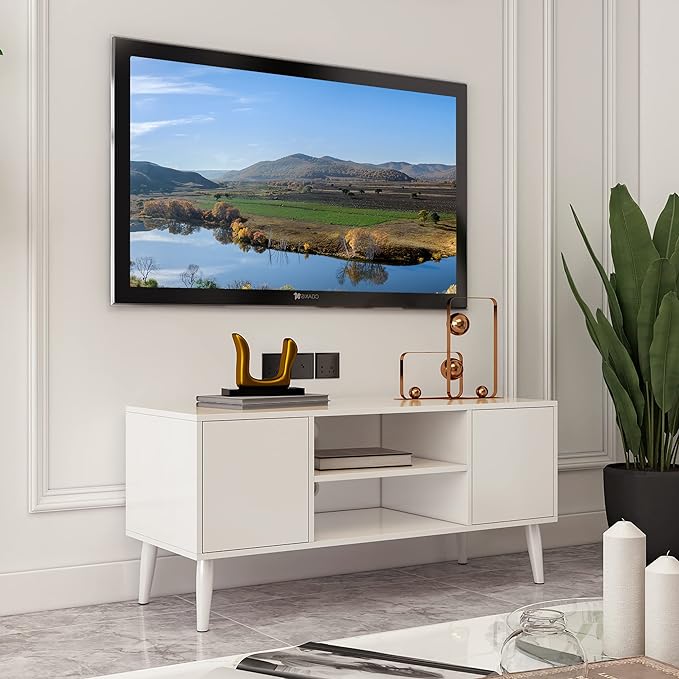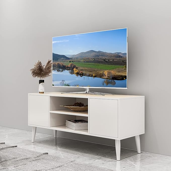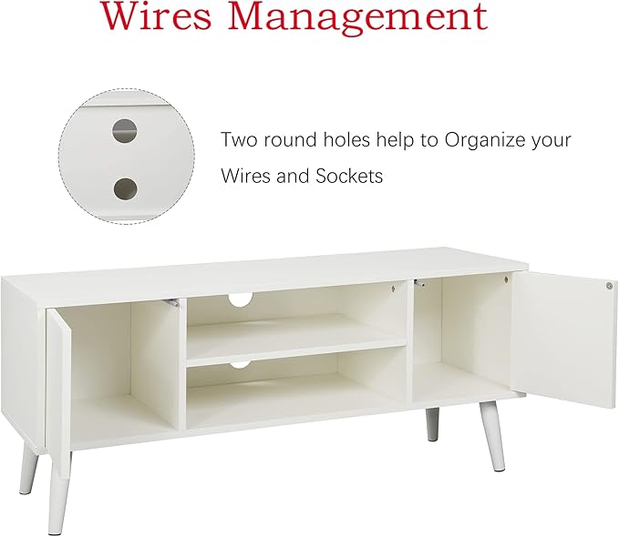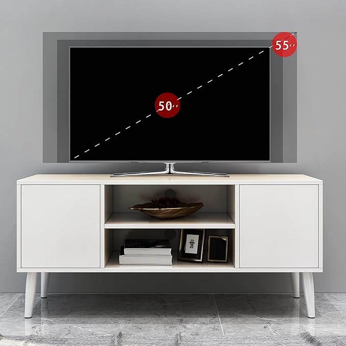 Yusong Retro TV Stand for 55 Inch TV, Entertainment Centers for Living Room Bedroom, Wood TV Bench Table TV Console TV Cabinet with 2 Storage Cabinets and Open Shelves,White
