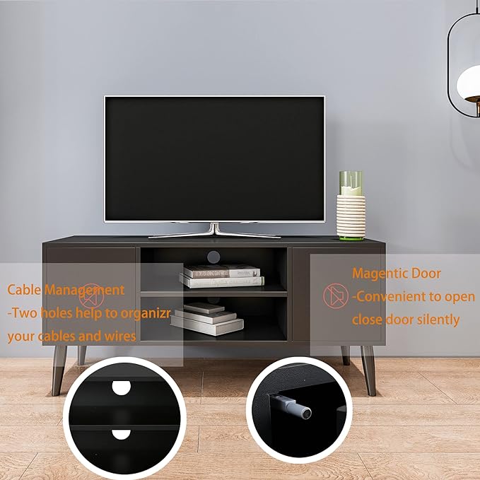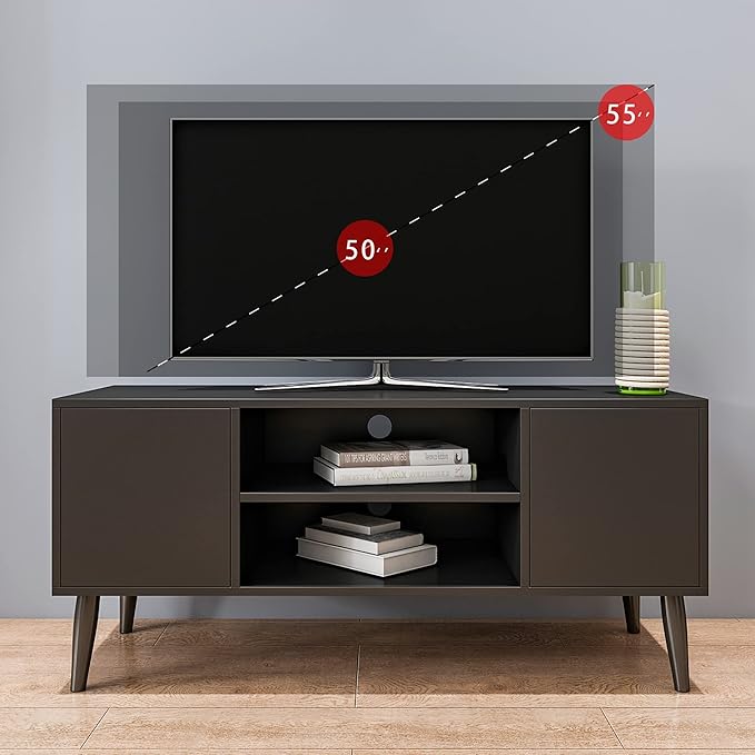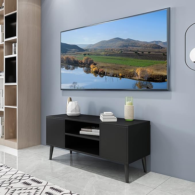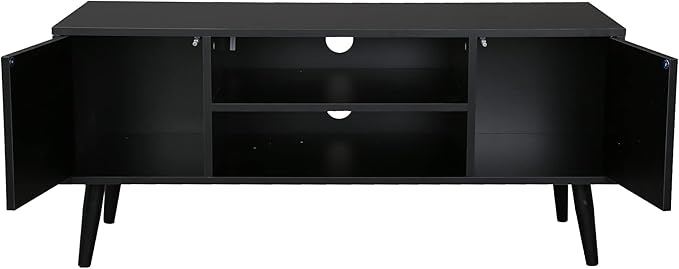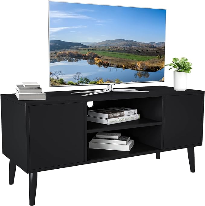 Yusong Retro TV Stand for 55 Inch TV, Entertainment Centers for Living Room Bedroom, Wood TV Bench Table TV Console TV Cabinet with 2 Storage Cabinets and Open Shelves, Black