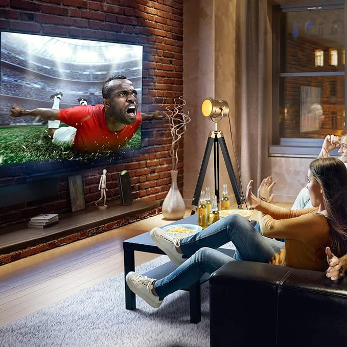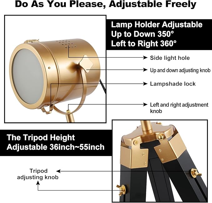 Mordern industrial tripod floor lamp for living room, bedroom office, vintage gold brass standing reading light floor lamp with camera tripod wood, rotatable nautical spotlight floor lamp black