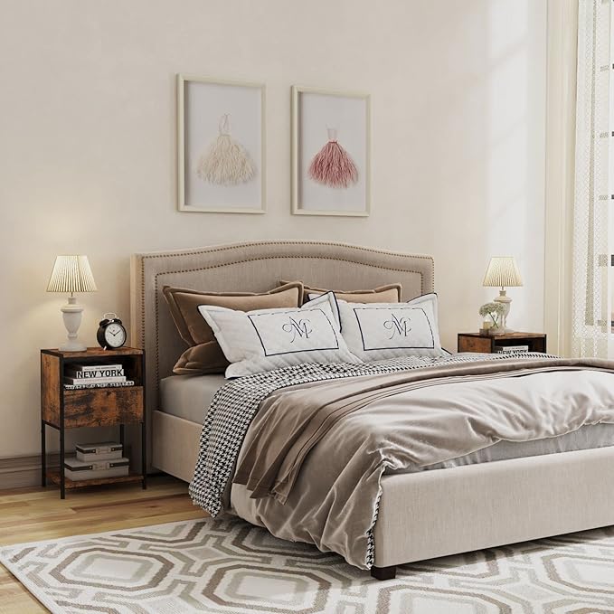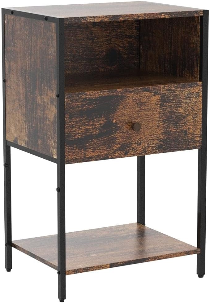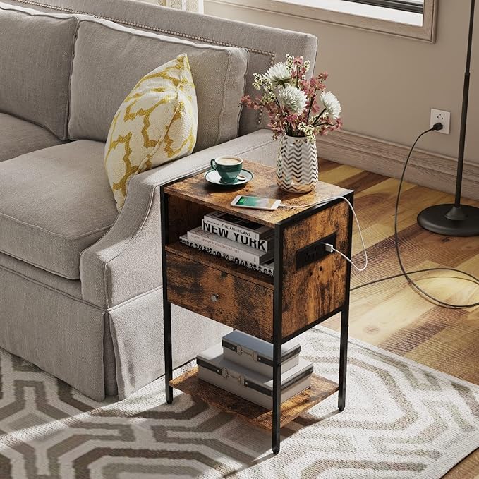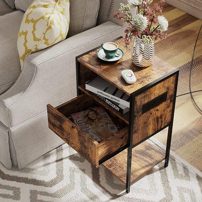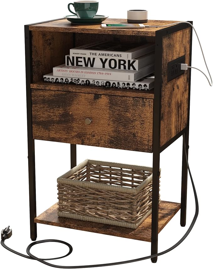 LDTTCUK Nightstand with Charging Station, Modern End Table with Drawer, Bedside Table with Open Storage for Bedroom,Rustic Brown