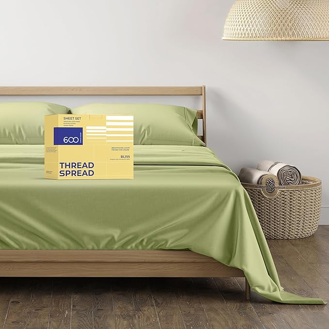 THREAD SPREAD 600 Thread Count Sheets Queen - 100% Egyptian Cotton Sheets Queen Size, 4 PC Luxury Sheets Queen Size, Soft, Cooling, Extra Long Staple 16" Deep Pocket Queen Bed Sheet Set - Sage Green