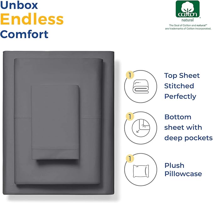 THREAD SPREAD Striped Egyptian Cotton Sheets Twin XL Size - 600 Thread Count 3 PC Damask Twin XL Sheets Deep Pockets, Sateen Weave College Dorm Bedding Twin XL, Fits Mattress upto 18" - Dark Grey