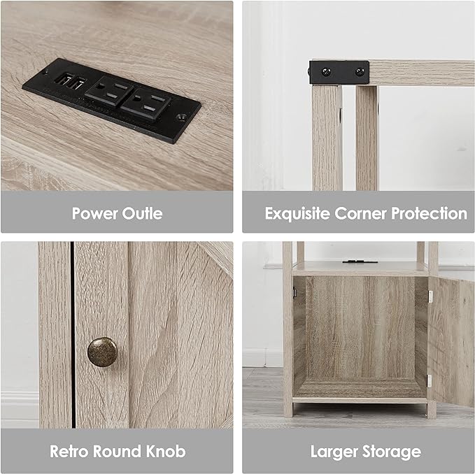 Farmhouse Nightstand with Charging Station, Rustic End Table Bedroom with Storage Living Room Side Table Beige Night Stand Industrial Bedside Bed Table with USB Ports and Outlets
