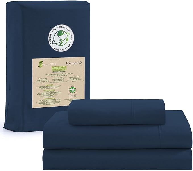 LANE LINEN 100% Organic Cotton Twin XL Sheets Set 3-Piece Pure Percale Bedsheets Soft Bedding Breathable Fits Mattress Upto 15" Deep - Estate Blue
