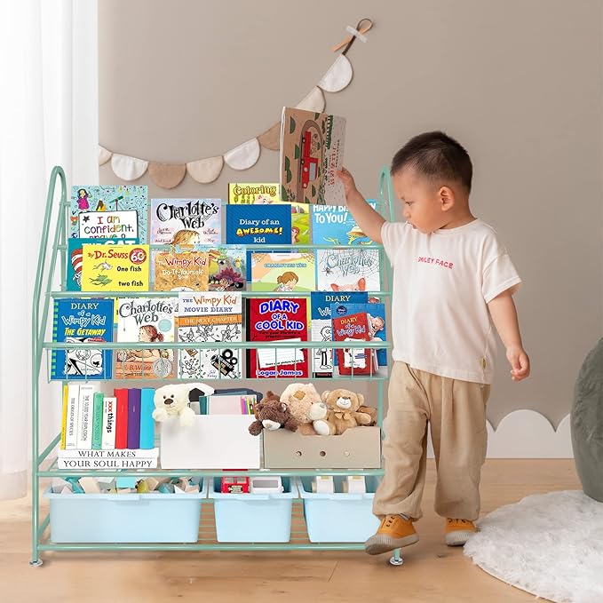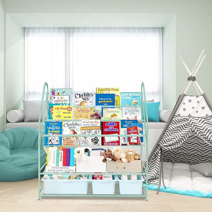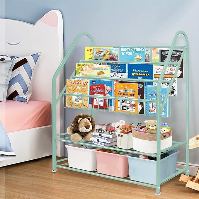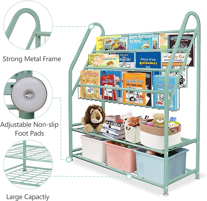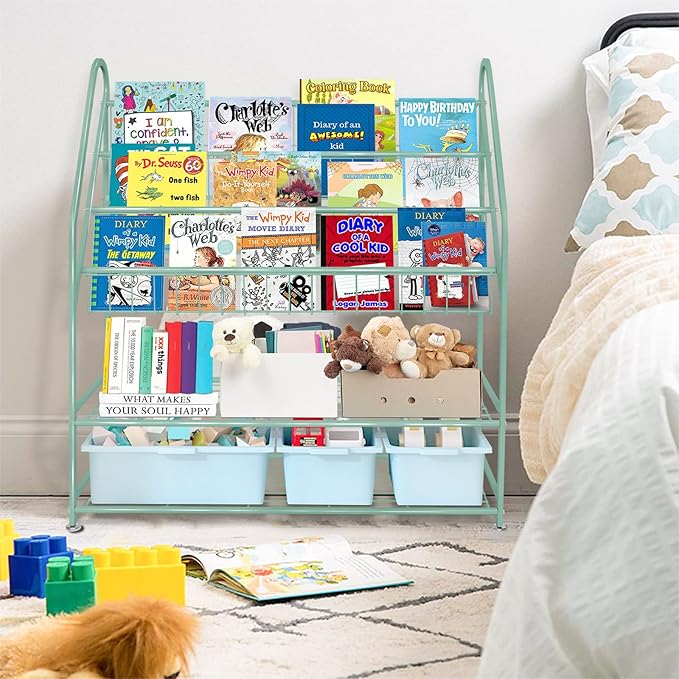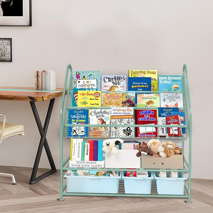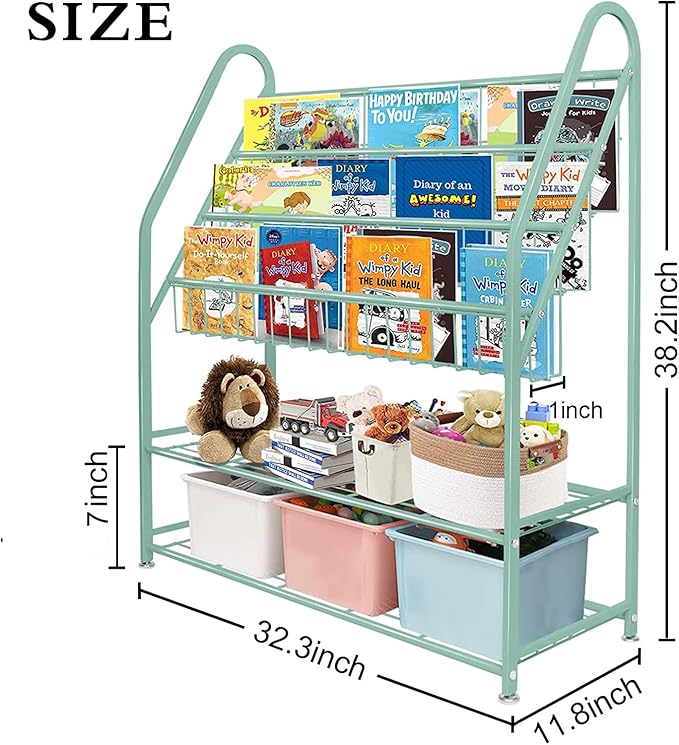 aboxoo Metal Kids Bookshelf Green Freestanding for Children Room 32 in Toy Organizer Book Unit Storage Large Green Stable Bookcase Bookstore Living Room Bed Room Library