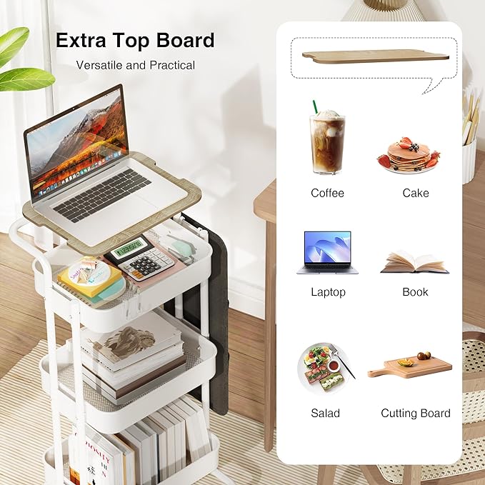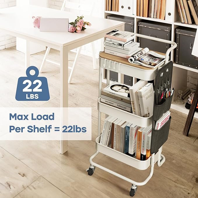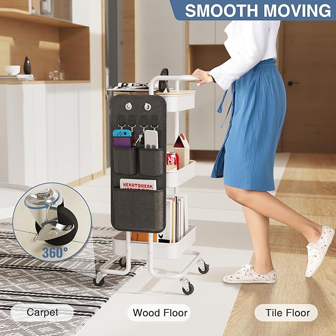 DTK 3 Tier Metal Utility Rolling Cart with Table Top and Side Bags, Metal Tray Storage Organizer Cart with Wheels, Art Craft Cart with 4 Hooks for Kitchen Bathroom Office Living Room (White)