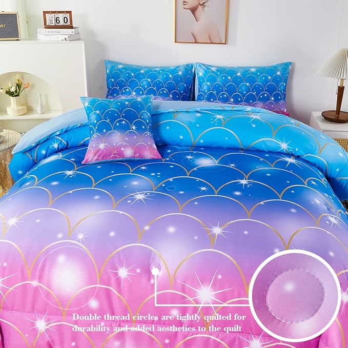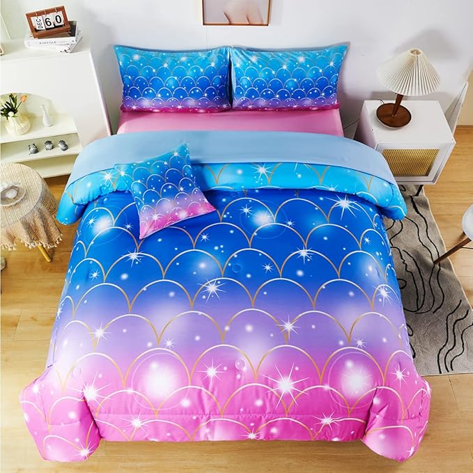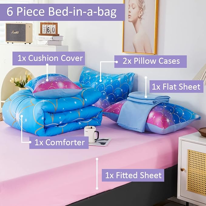 URBONUR 6Pcs Mermaid Comforter Set Queen for Girls Glitter Fish Scales Printed Bedding Set on Gradient Pink Purple Blue Soft & Fluffy Girls Bed Set with Sheets for Queen Bed