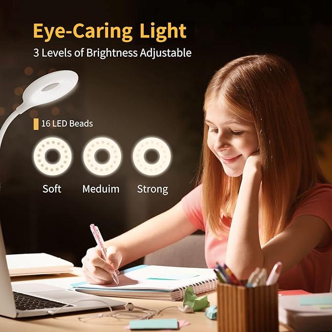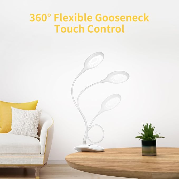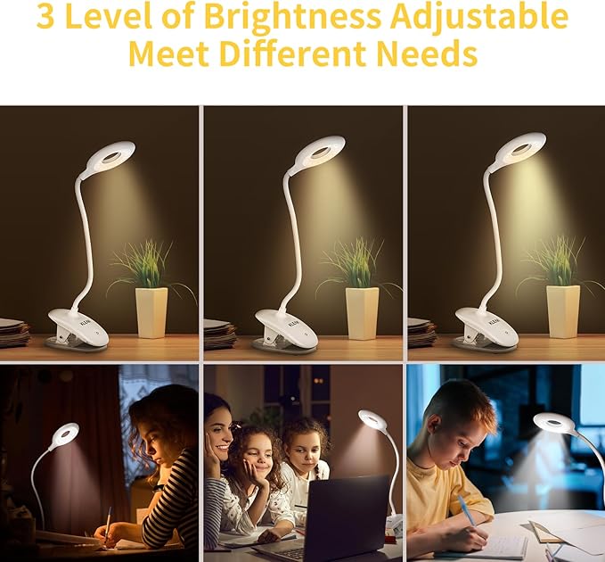 Clip on Light for Bed & Desk, Reading in Bed, Dorm, Flexible Gooseneck, Battery Operated Rechargeable Clamp Lamp for Headboard, Eye-Caring LED Light with 3 Brightness Modes