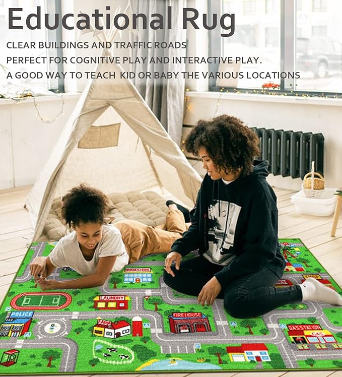 Kids Playroom Rug City Life Playmat Kids Rug for Hot Wheels Car 5.2'x3'3" City Map Traffic Road Learning Educational Area Rug Carpet for Children Bedroom Nursery Room Game