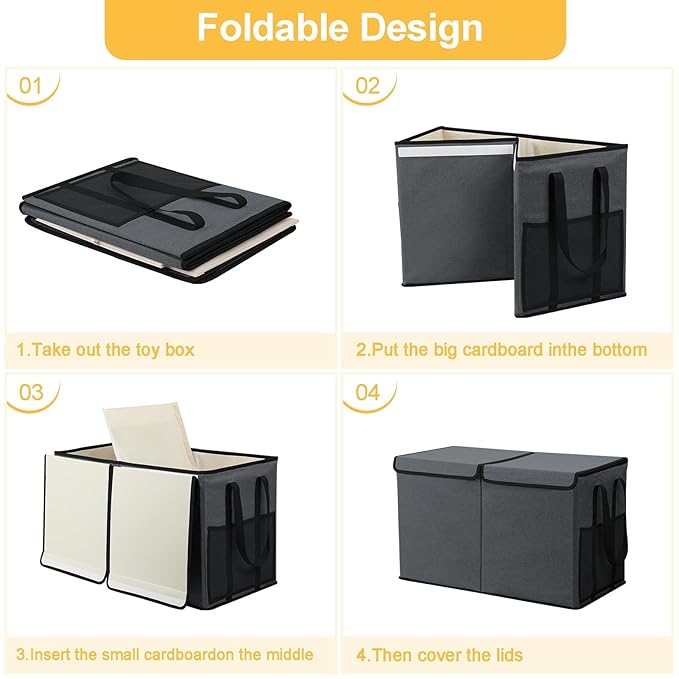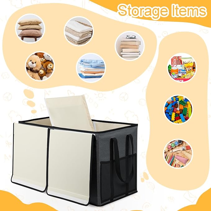 • 𝐅𝐋𝐈𝐏 𝐓𝐎𝐏 𝐂𝐎𝐕𝐄𝐑 - The middle of the kids toy storage organizer with removable velcro divider for separate storage, you can also choose not to use the divider to store large items. It also comes with an integrated lid to declutter the room and prevent dust from entering.