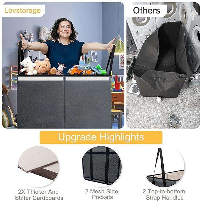 • 𝟐𝐗 𝐓𝐇𝐈𝐂𝐊𝐄𝐑 𝐐𝐔𝐀𝐋𝐈𝐓𝐘 𝐂𝐀𝐑𝐃𝐁𝐎𝐀𝐑𝐃 - 2X thicker and 2X stiffer cardboard which is made of natural paper pulp, It doesn't have any awkward odor so your child can use this storage box with confidence. Importantly, the toy chest for boys girls can keep its structure very well even if it withstands up to 20KG kids' toys.