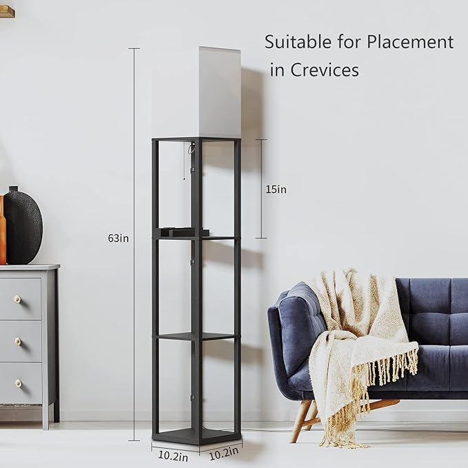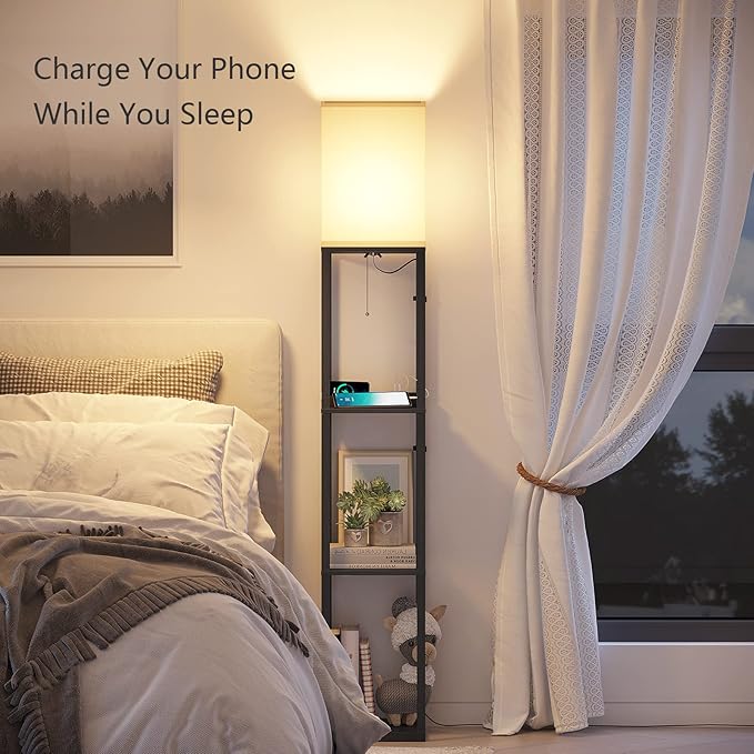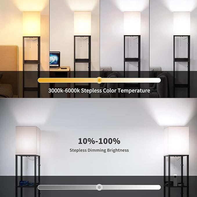 SUNMORY Shelf Lamp with Remote Control, Stepless Color Temperature & Dimmable, Floor Lamp with Shelves with 2 Usb Charging Ports and 2-Hole Socket, Solid Wood Tall Lamps for Living Room, Bedroom,Black